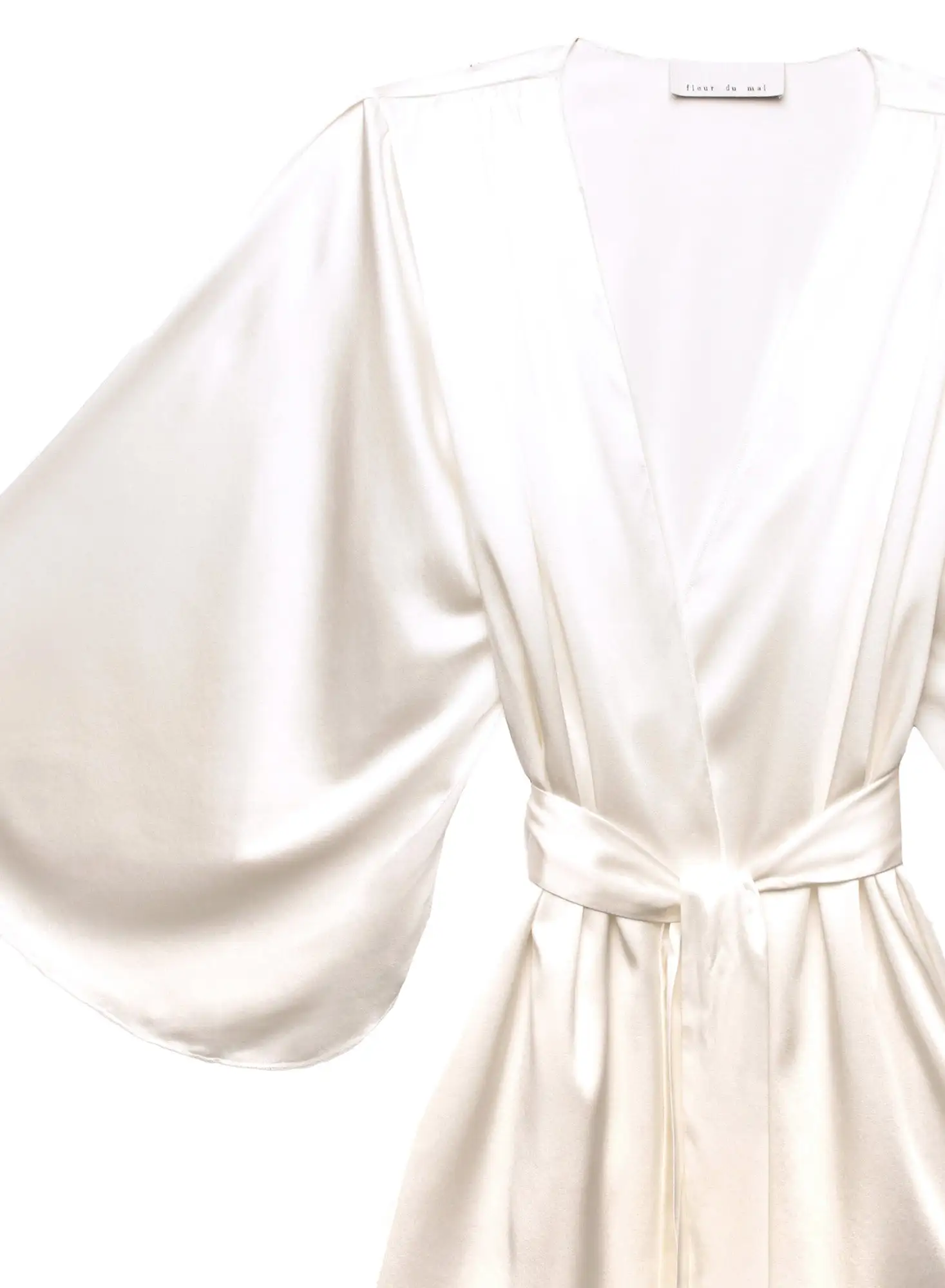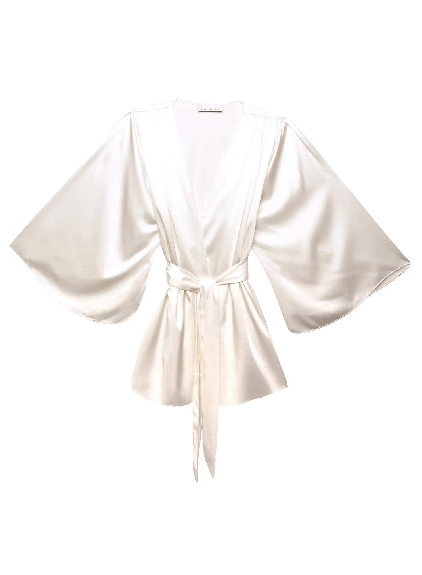 Angel, baby. Our Angel Sleeve Robe features a playful fit with wide sleeves. Wraps across the body and is secured by a sash. Can be worn as a robe, blazer or jacket. Pair with the Gardenia Lace Demi Bra and Thong for an immaculate set.Â