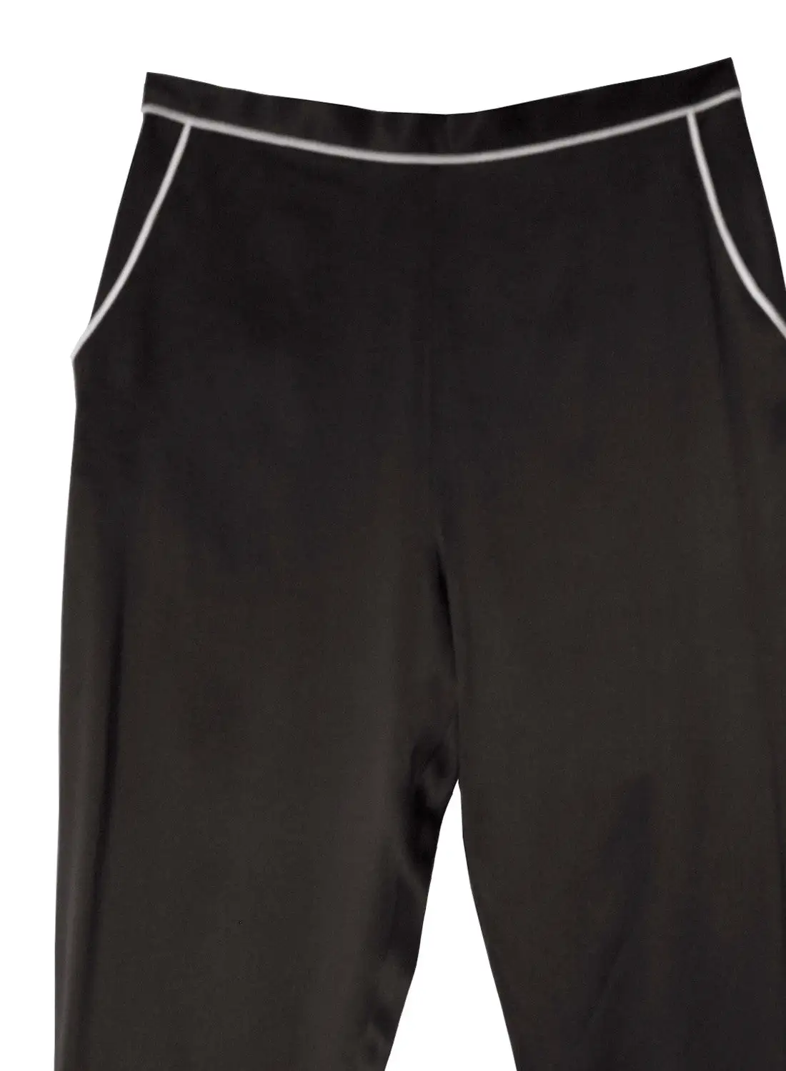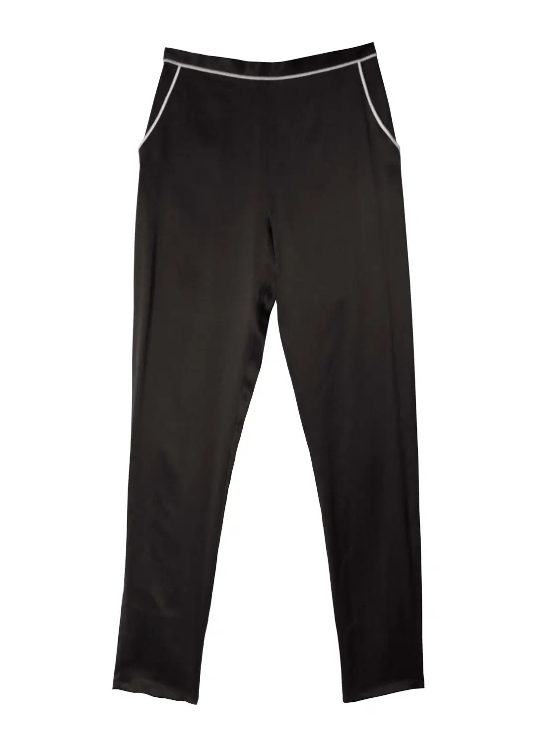 Silk pajama pant with contrast back seam piping. Flat front waistband with elastic in back. Wear it out or for a sexy & chic bedtime set, pair with the matching Fleur PJ Top.