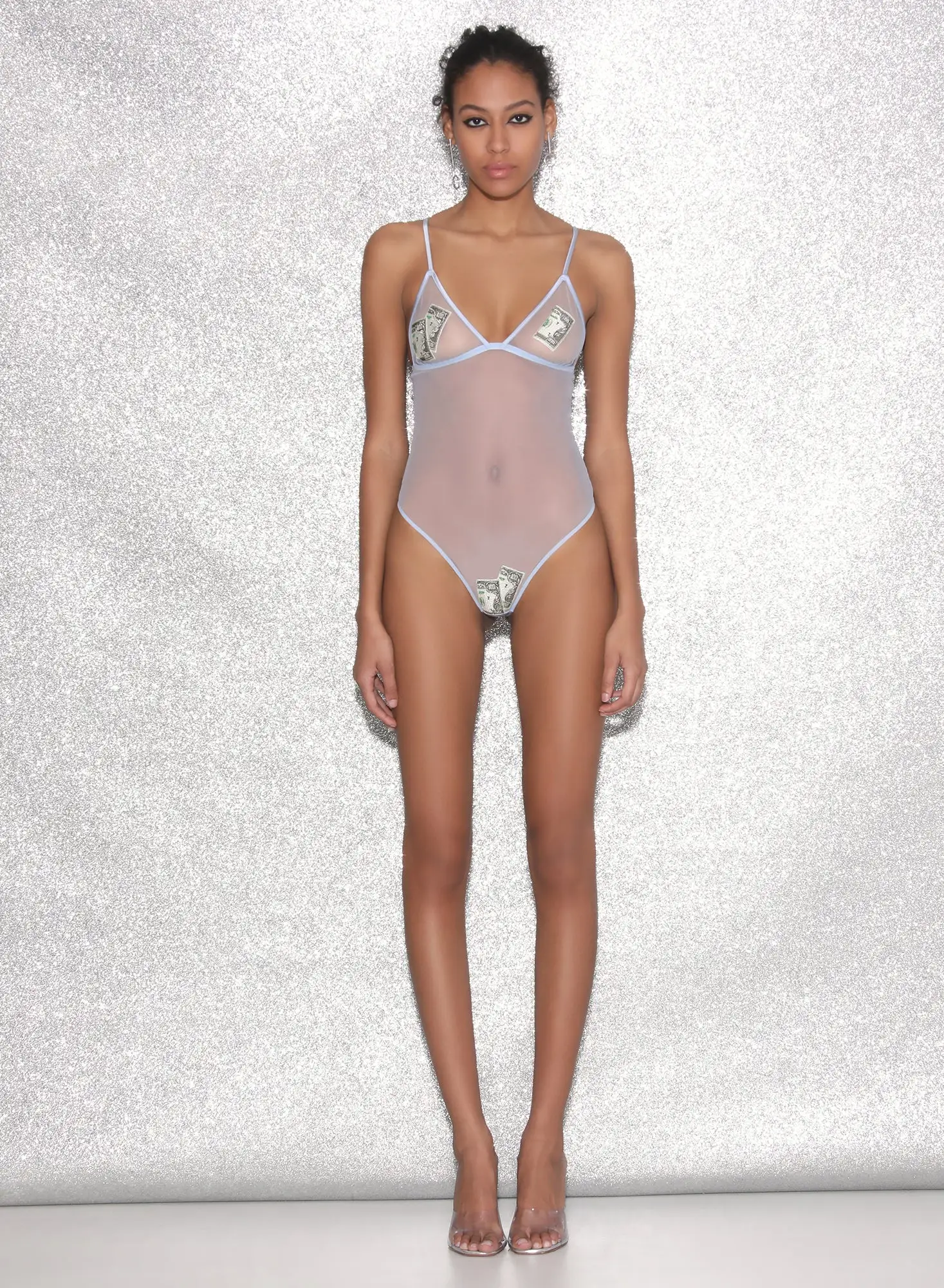 You’re so money, baby. Our ultra hot Big Spender Embroidery Bodysuit, cut from sexy sheer mesh with custom cash embroidery. Features luxe silk trim with adjustable straps and back keyhole detail. Snap bottom with thong cut back. Pair with trousers or flaunt on its own to make a statement at the bar or in the bedroom.