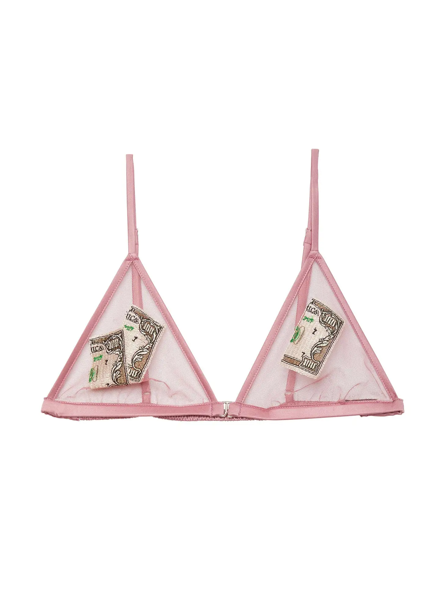 It’s all about the Benjamins, baby. Indulge with our Big Spender Embroidery Triangle Bra, featuring custom cash embroidery on sheer tulle ground. Luxe silk trim with adjustable straps and front closure. Complete this seriously sexy set with the matching Big Spender Embroidery V String.