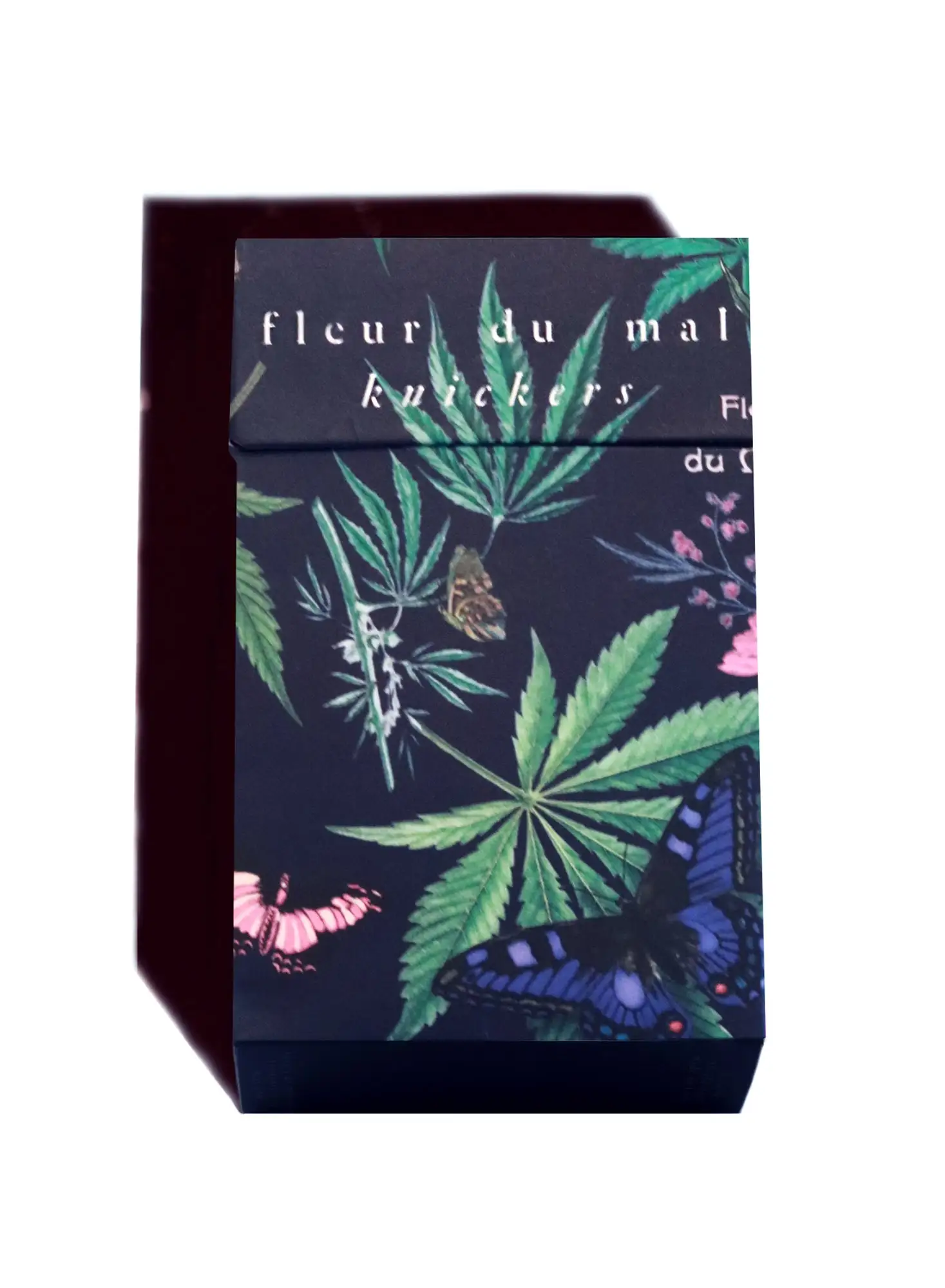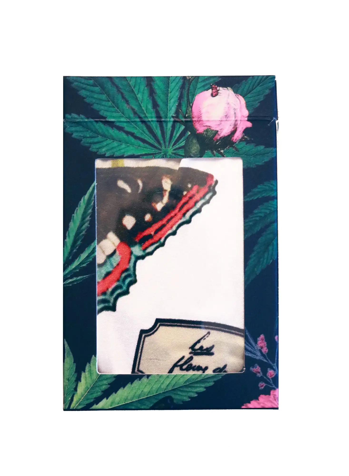 Smokeshow. Our Botanical Printed Cheeky in papillon white. Composed of silk fabric that offers a stretch fit. Scalloped trim and back keyhole detailing. Packaged in our le smoking pack.