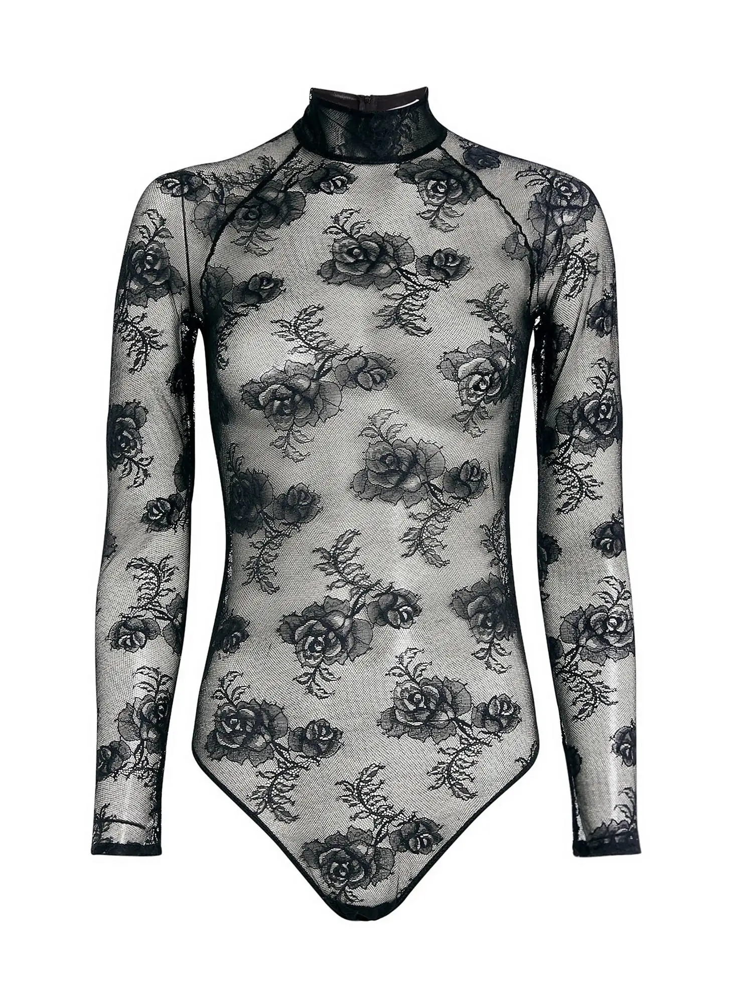 Our Bouquet Lace Turtleneck Bodysuit is beautifully cut from stretch floral lace. Tonal stitching. Back zipper and bottom snap closures. High leg cut. Layer it under the Side Draped Skirt or on its own under jeans with the Luxe Triangle Bra underneath.