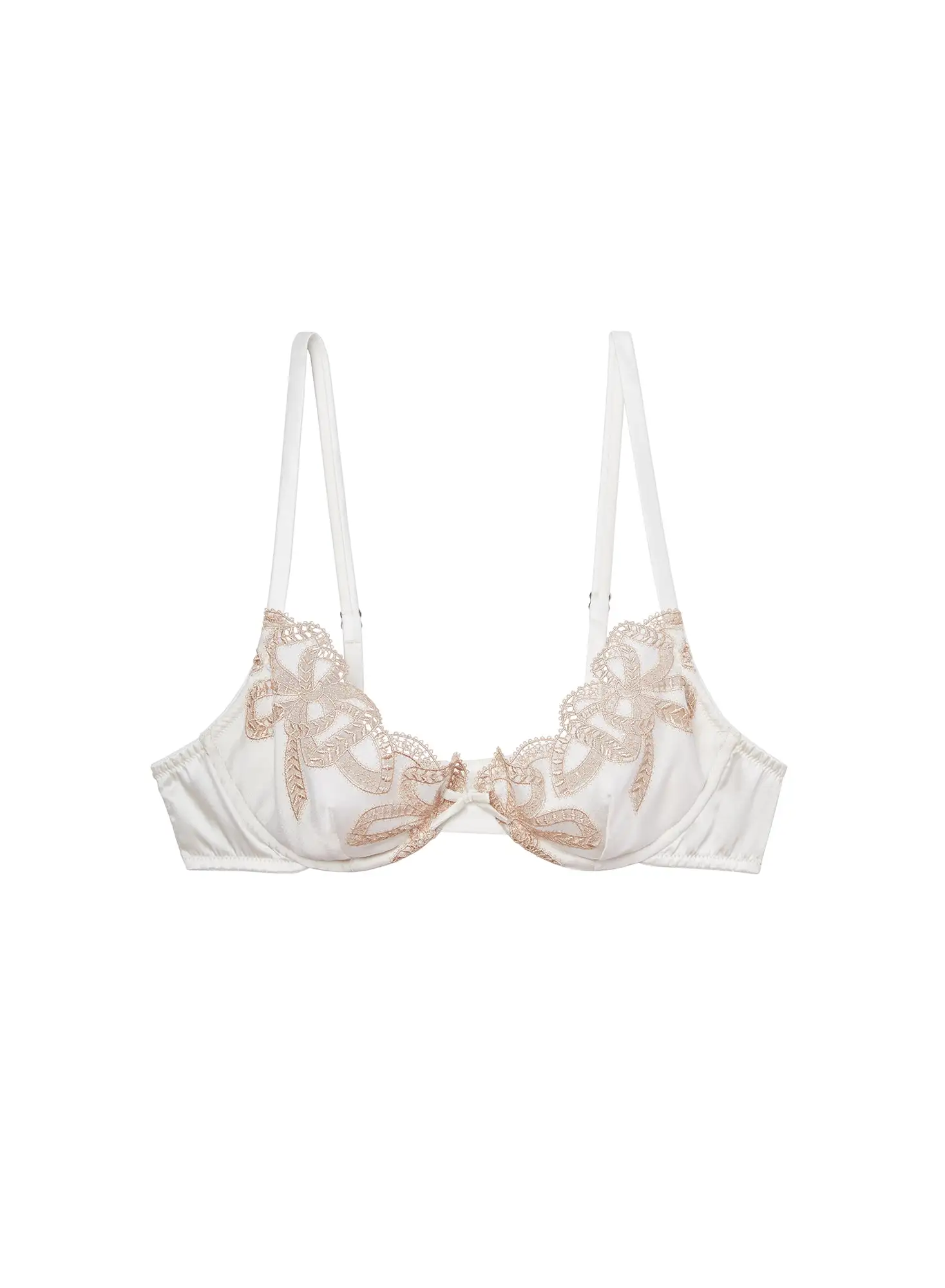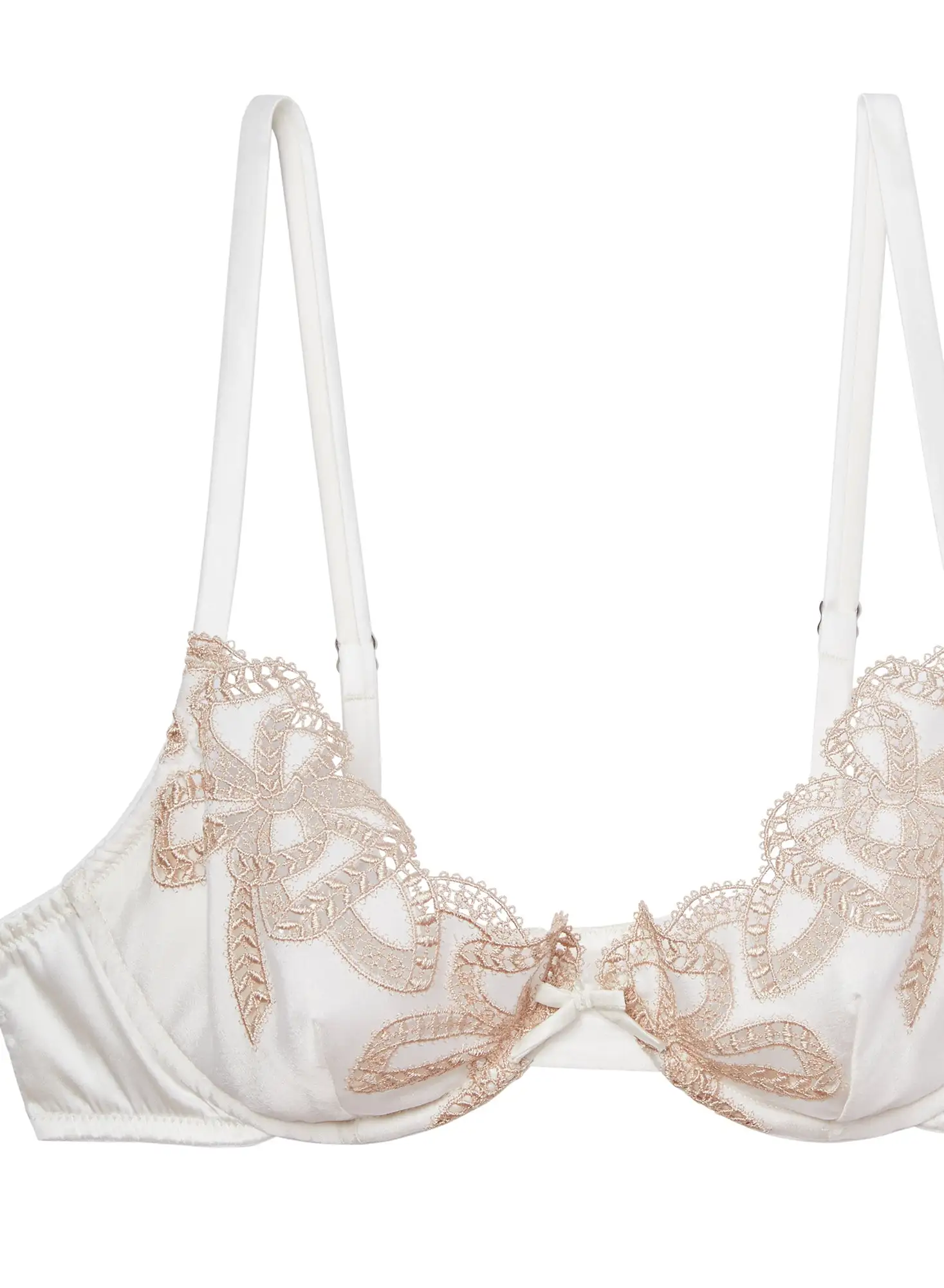 Make me blush. Our Bow Guipure Embroidery Bra, featuring lustrous ivory silk lined demi cups with delicate bow guipure lace appliqué detail. Adjustable silk straps and stretch silk wings for support. Back hook and eye closure. Complete this stunning set with the matching Bow Guipure Embroidery Garter Belt and Thong.
