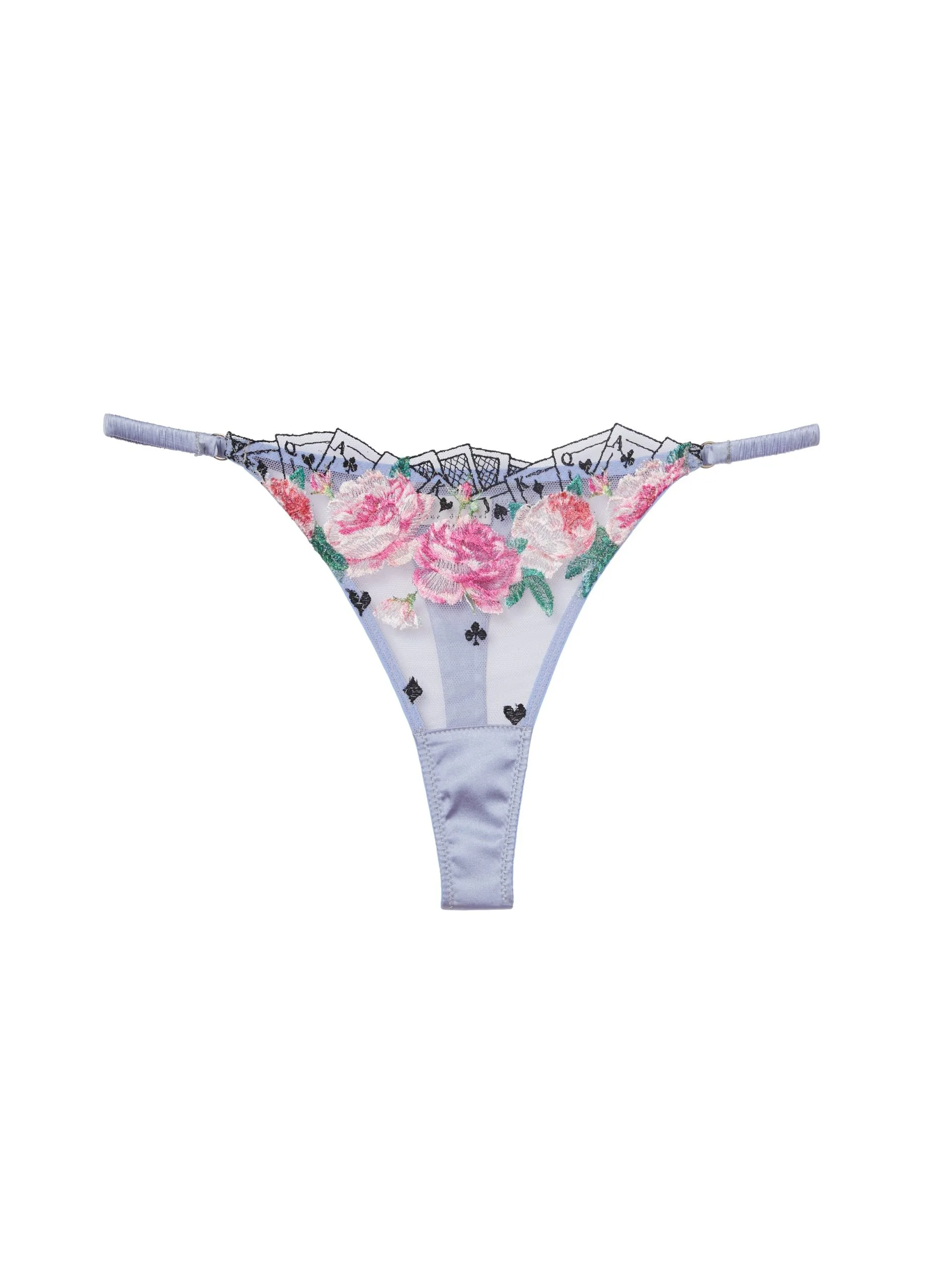 Let’s get lucky. Our Card Embroidery Thong features custom playing card and floral embroidery on mesh ground. Flirty scalloped front with luxe silk back. Play your cards right with the matching Card Embroidery Balconette and Garter.