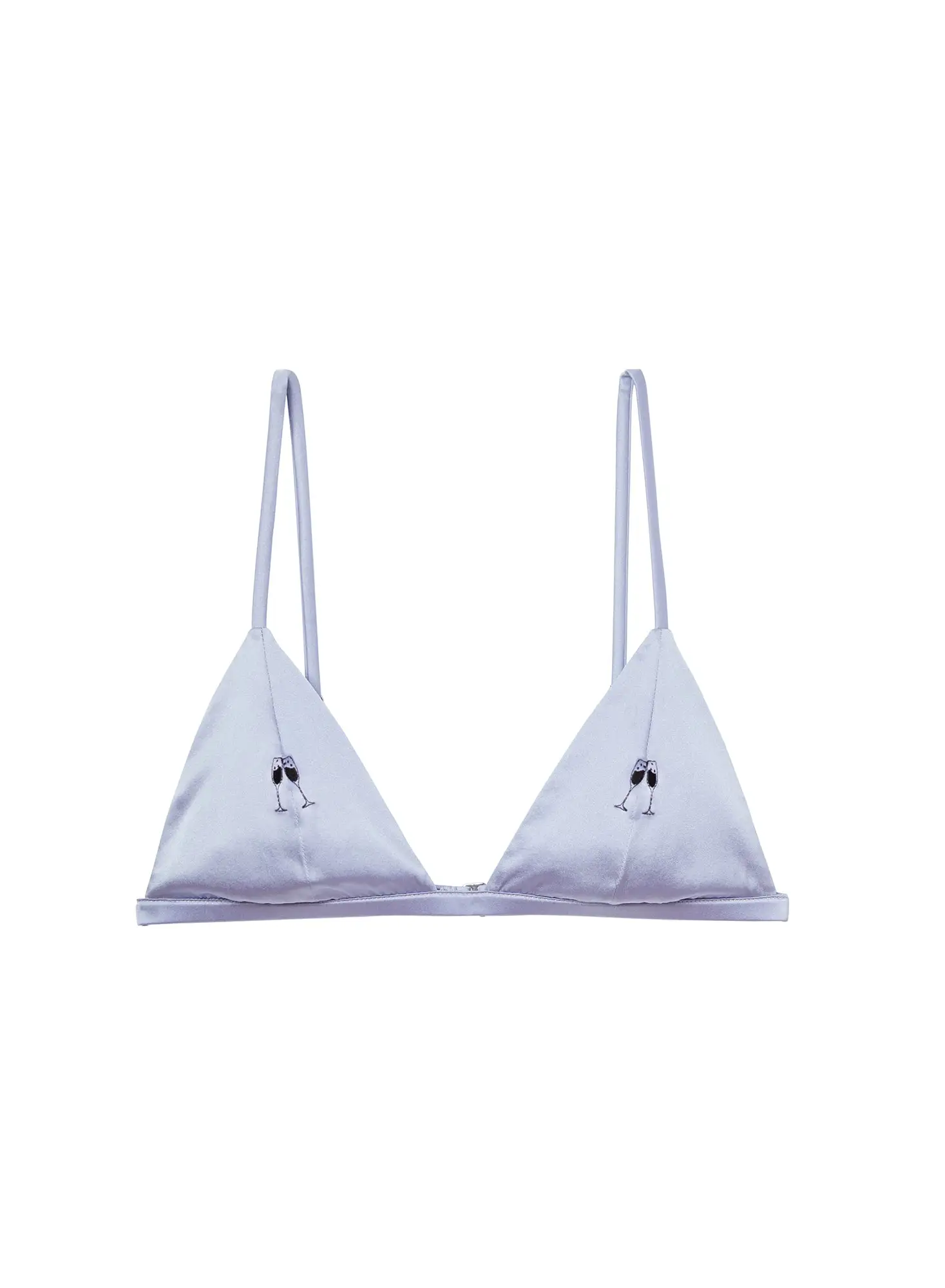 Thirsty? Our best selling, stretch silk satin Luxe Triangle Bra with flirty embroidered champagne flute detail. Features smooth band and silk lined cups, this bralette works perfectly as a luxe everyday bra, or worn by itself as a top under a blazer. Quench your thirst with the matching Champagne Embroidered Luxe V String.