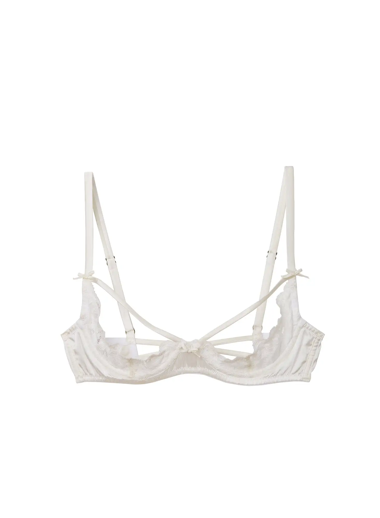 Play peekaboo in our barely-there underwire bra. Charlotte lace quarter cup with silk front straps that frame the bust. Bows at center front and front straps. Stretch satin band with swan hook closure. Complete the look with the Charlotte Lace Crotchless Panty.
