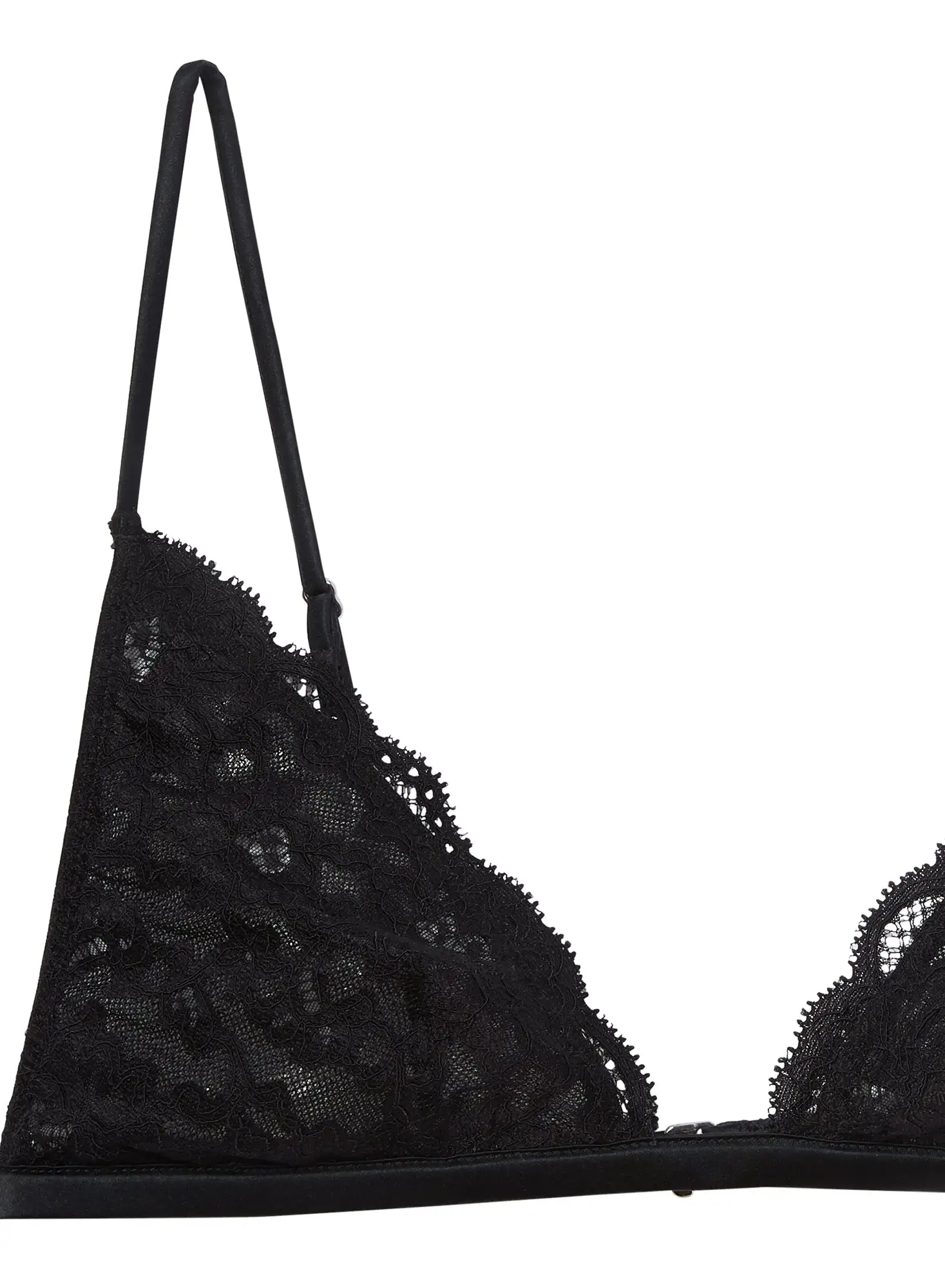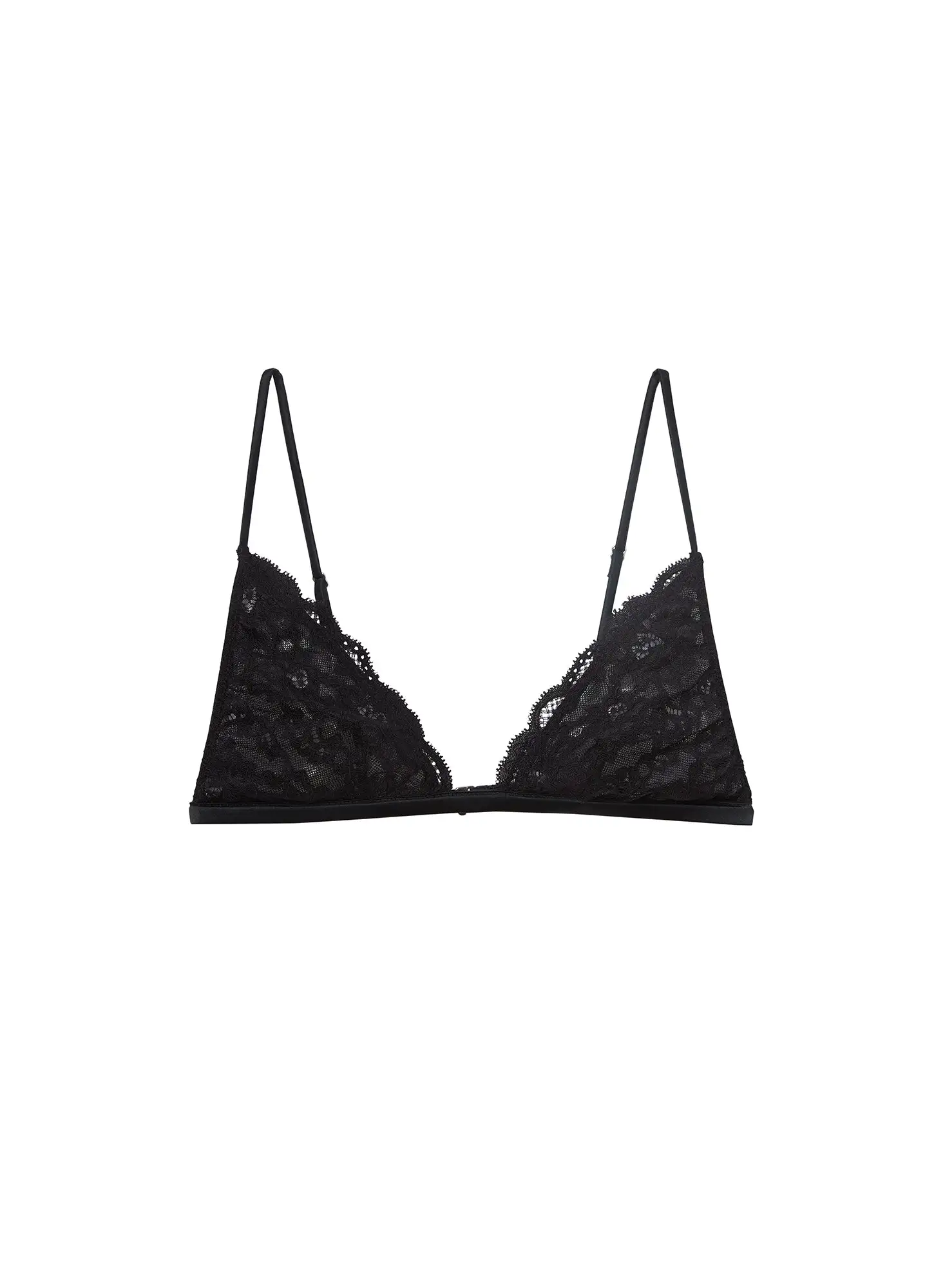 New noir. Our delicate Charlotte Triangle Bra is cut from the softest lace that lays comfortably and flat against your skin. Features scalloped lace detailing throughout and soft triangle cups. Silk band with hook & eye back closure and adjustable straps. Complete the look with your favorite matching Charlotte Lace panty.