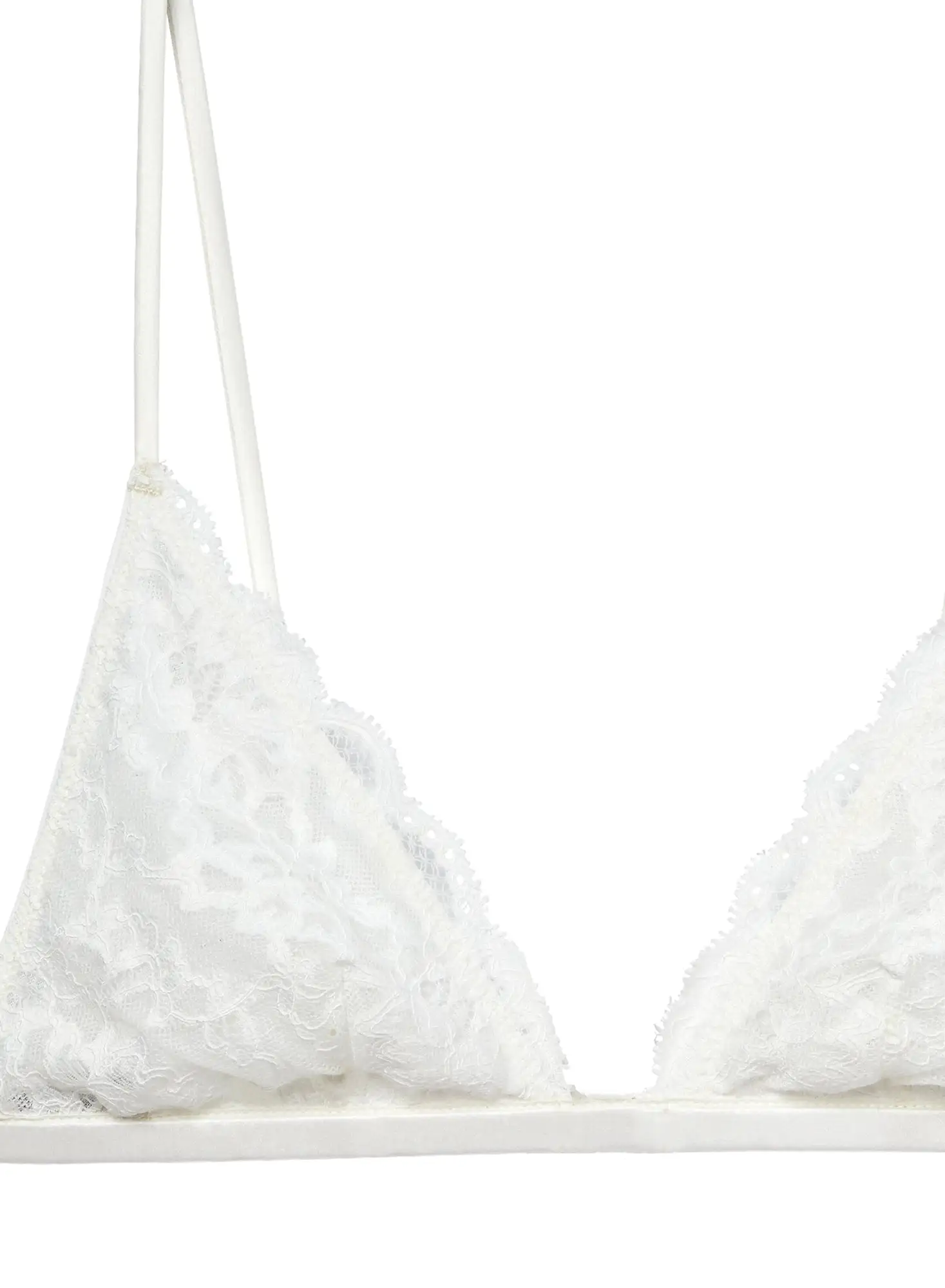 Touch of ivory. Our delicate Charlotte Triangle Bra is cut from the softest lace that lays comfortably and flat against your skin. Features scalloped lace detailing throughout and soft triangle cups. Silk band with hook & eye back closure and adjustable straps. Complete the look with your favorite matching Charlotte Lace panty.