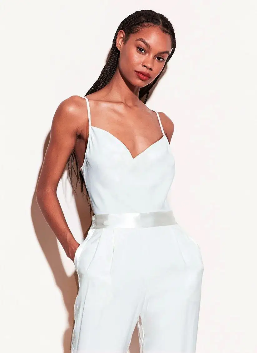 Our lustrous Cowl Neck Spaghetti Strap Cami in ivory is simple and chic. Bias cut silk charmeuse. Adjustable spaghetti straps and draped cowl neck. Perfect with the Ice Cream Embroidery Wide Leg Jean or paired with the Tuxedo Pant for a chic monochromatic look.