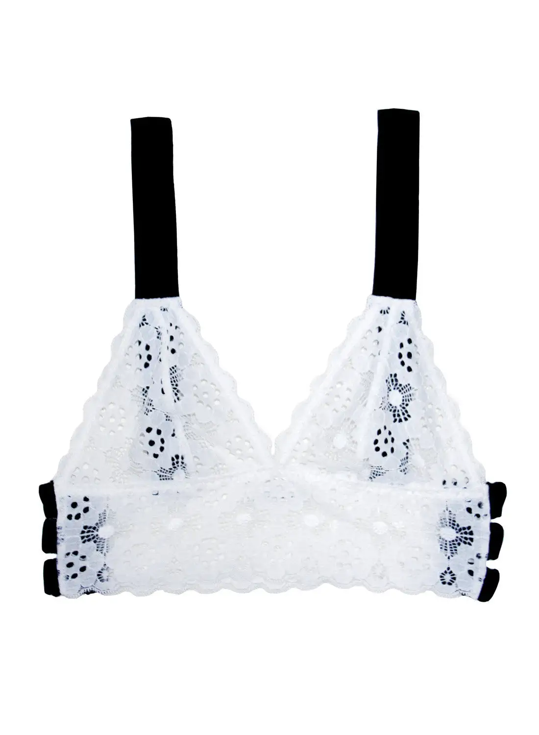 Stretch eyelet lace longline triangle bra. Plunge neckline with leather bow detail. No underwire, unpadded. Silk georgette straps & silk-covered elastic side bands. Perfect under a sheer top, or on its own with high waisted pants or skirt. Pair it with the Crochet Lace Cheeky.
