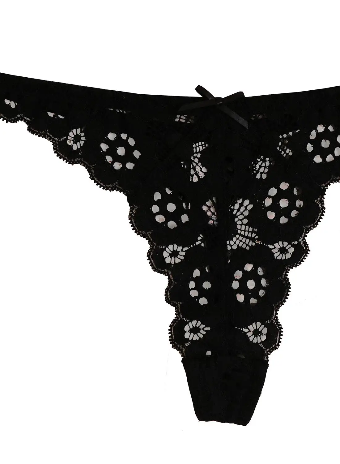 Stretch French lace eyelet thong. Slim band along sides. Sits flat, with leather bow at front. Pair it back to the Crochet Lace Balconettte Bra.