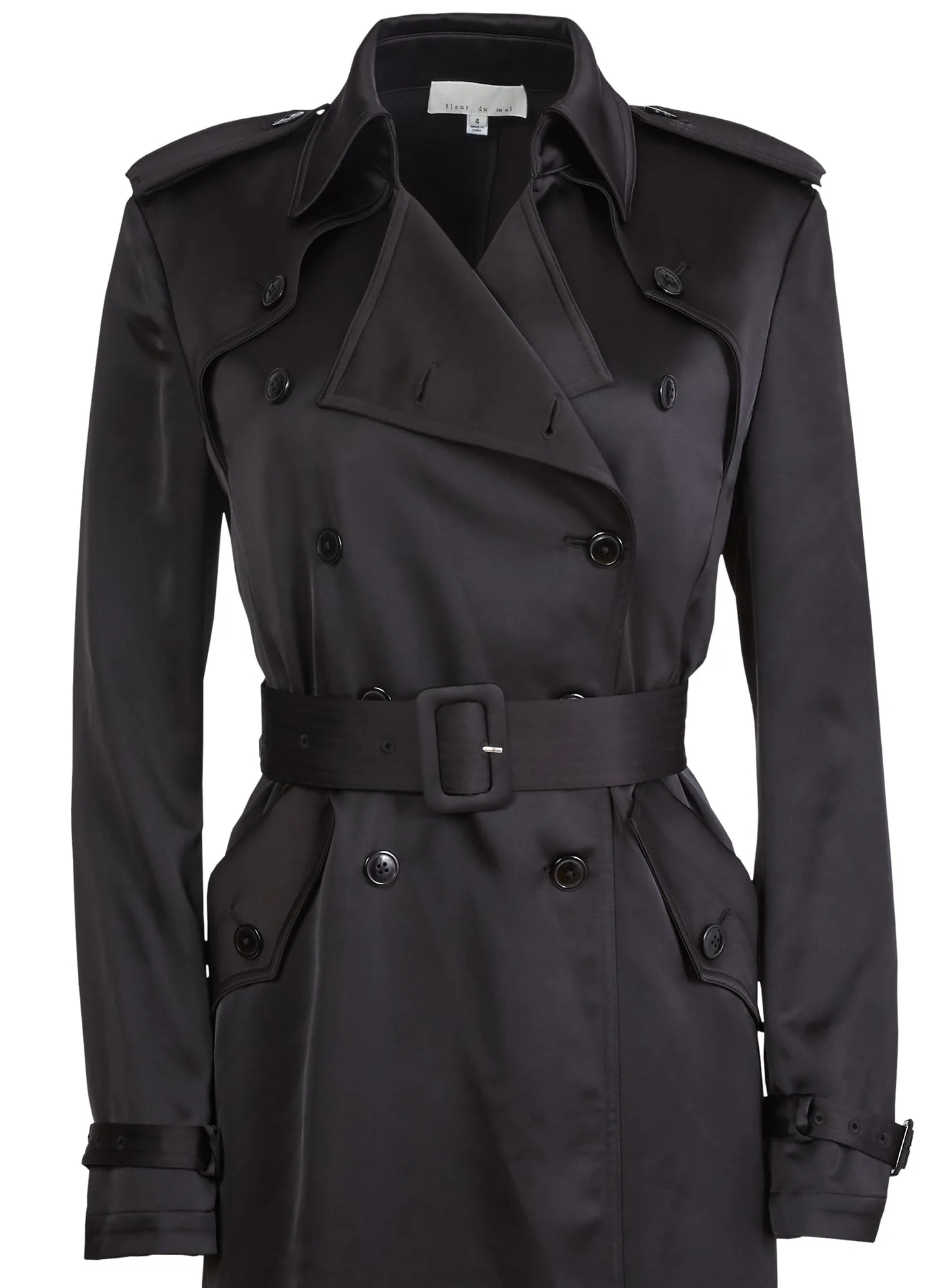 Recycled, and it feels so good. Our Eco Luxe Trench Coat is cut from a high-grade performance fiber made from 97% recycled materials. Features a notch collar and double breasted front with wrap belt closure. Belted cuffs. Front pocket and button detailing. Wear it with your favorite slip dress, or surprise someone late night with the Lily Embroidery Plunge Demi Bra and Hipster Thong underneath.