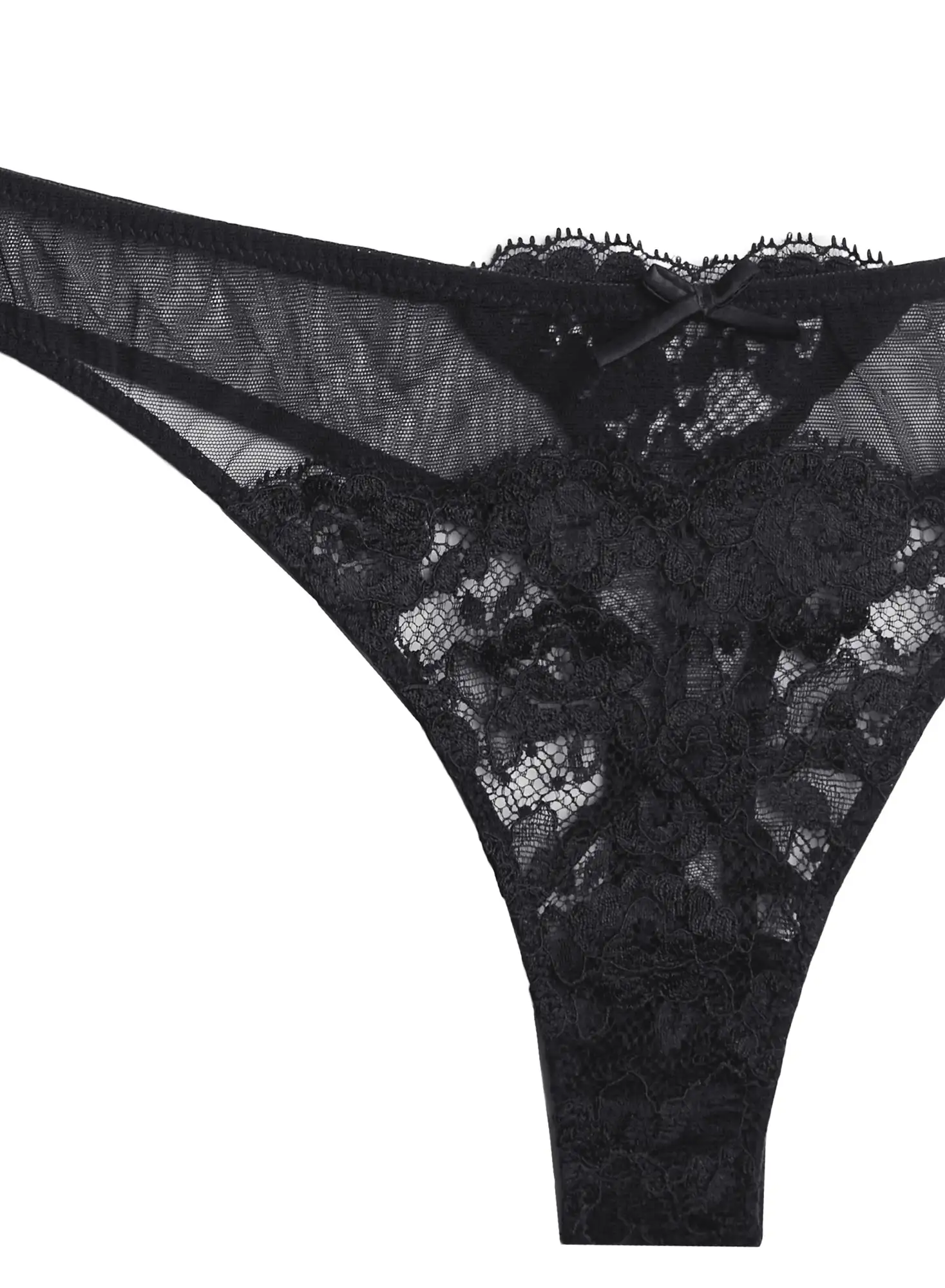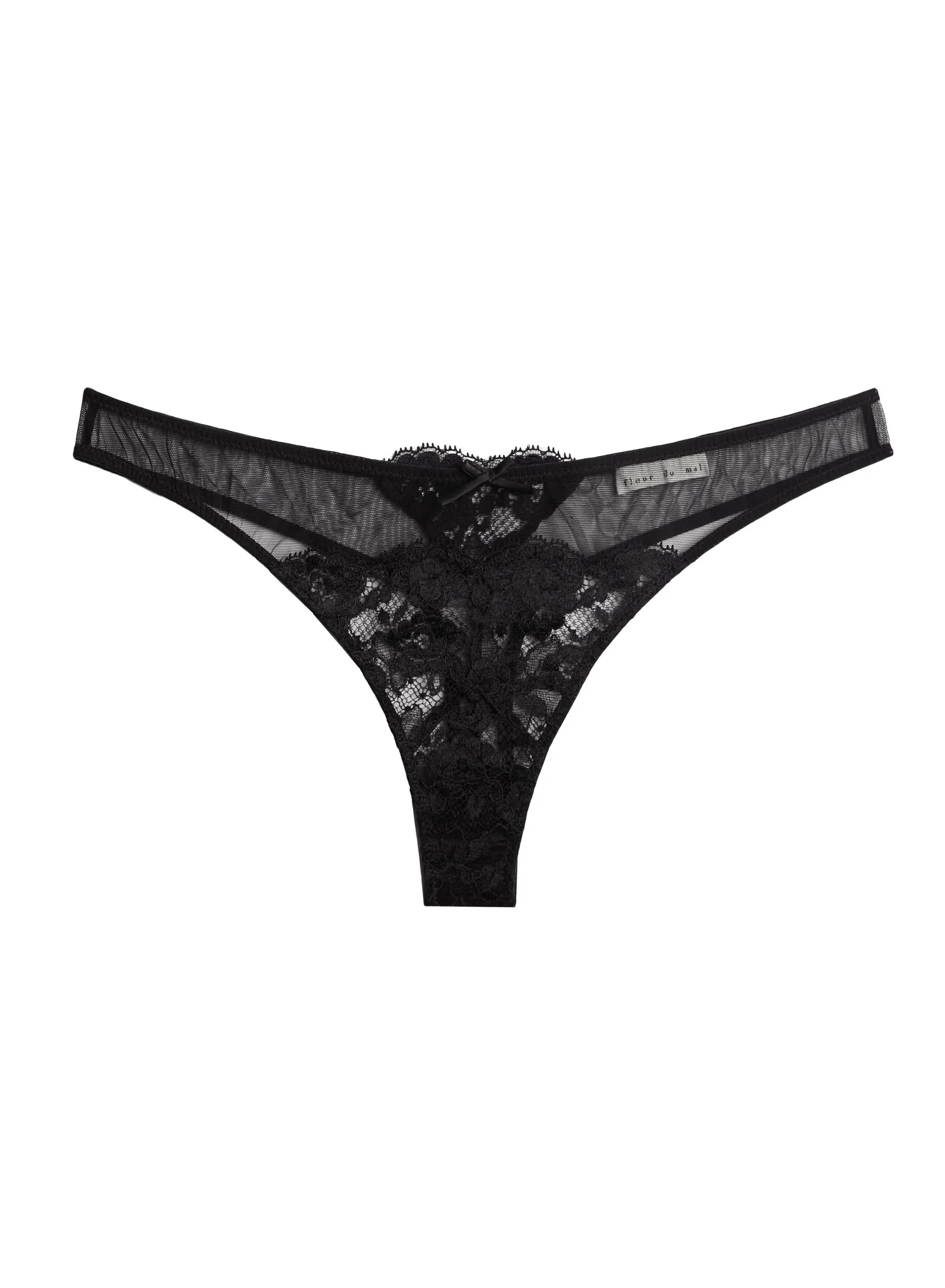 Little black thong. Our Foxy Lace Thong with floral lace and mesh paneling. Features front bow and back lace detail. Complete the set with matching Foxy Lace Half Cup Bra.