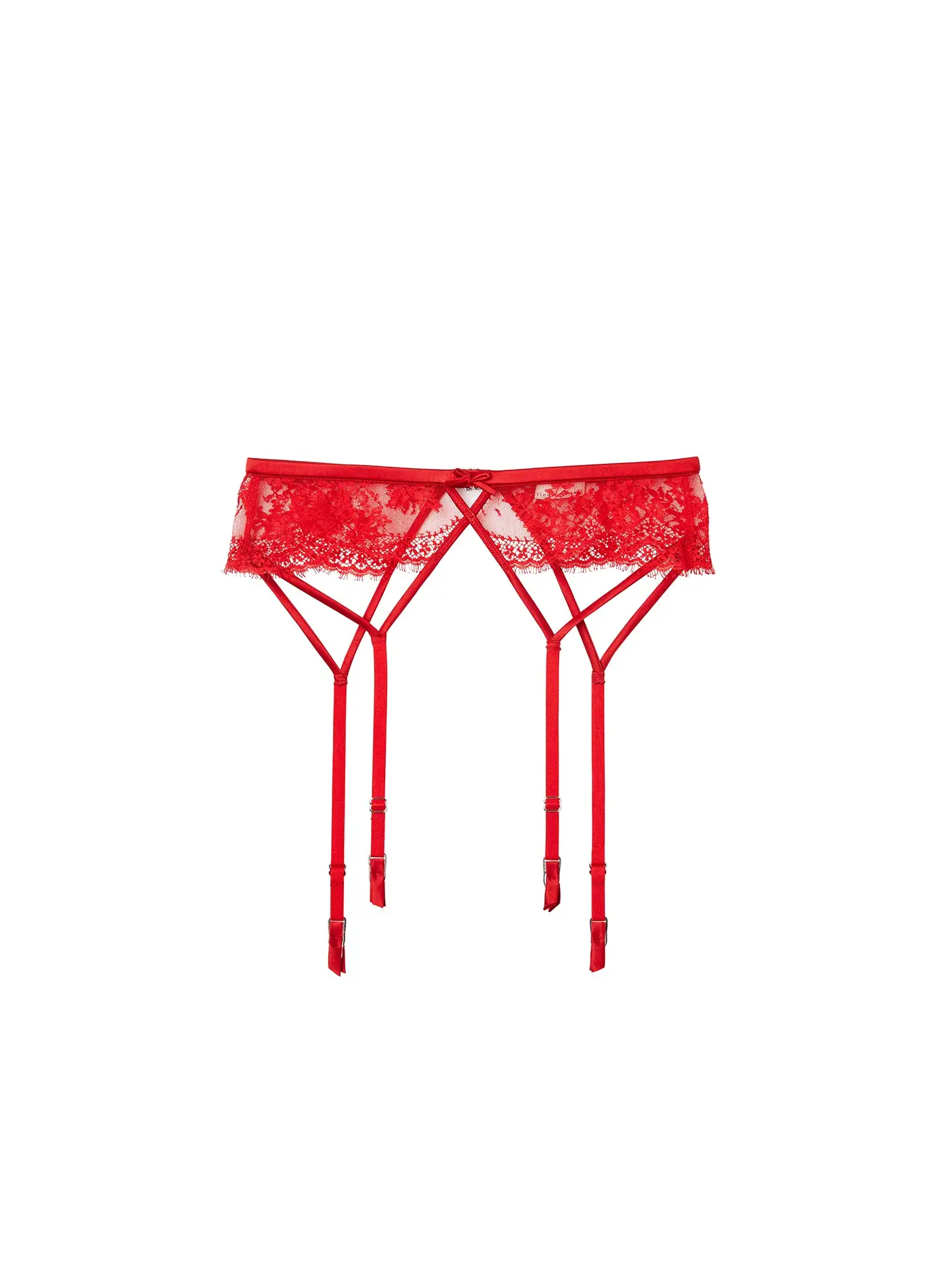 Our Frankie Lace Garter Belt is the perfect addition to amp up your lingerie set. Cut from stunning French leavers lace with scallop detailing along bottom hem. Luxe silk charmeuse accents at waistband. Center back closure sits at waist. Pair with the matching Frankie Lace Balconette Bra and Strappy Tanga for an immaculate set.