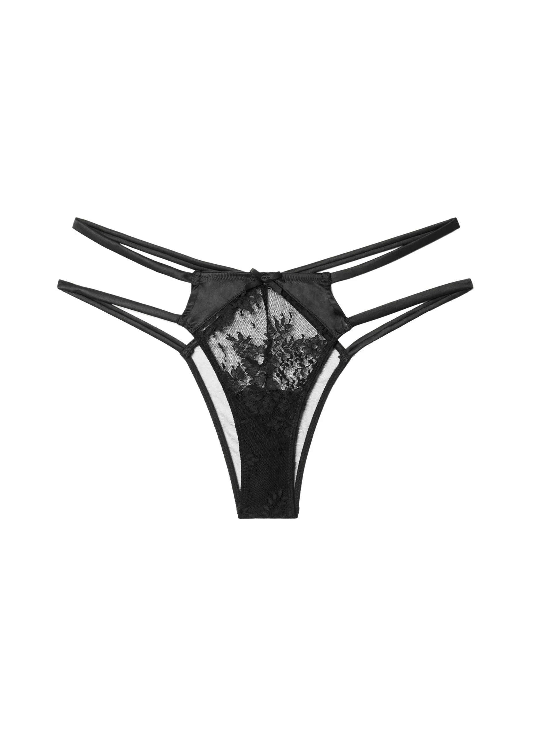 After dark attention. Our Frankie Lace Strappy Tanga, cut from stunning French leavers lace and trimmed in luxe silk charmeuse. Sexy cheeky fit with mesh back and cut out side paneling. Complete this intoxicating bedroom set with the matching Frankie Lace Balconette Bra and Strappy Garter Belt.