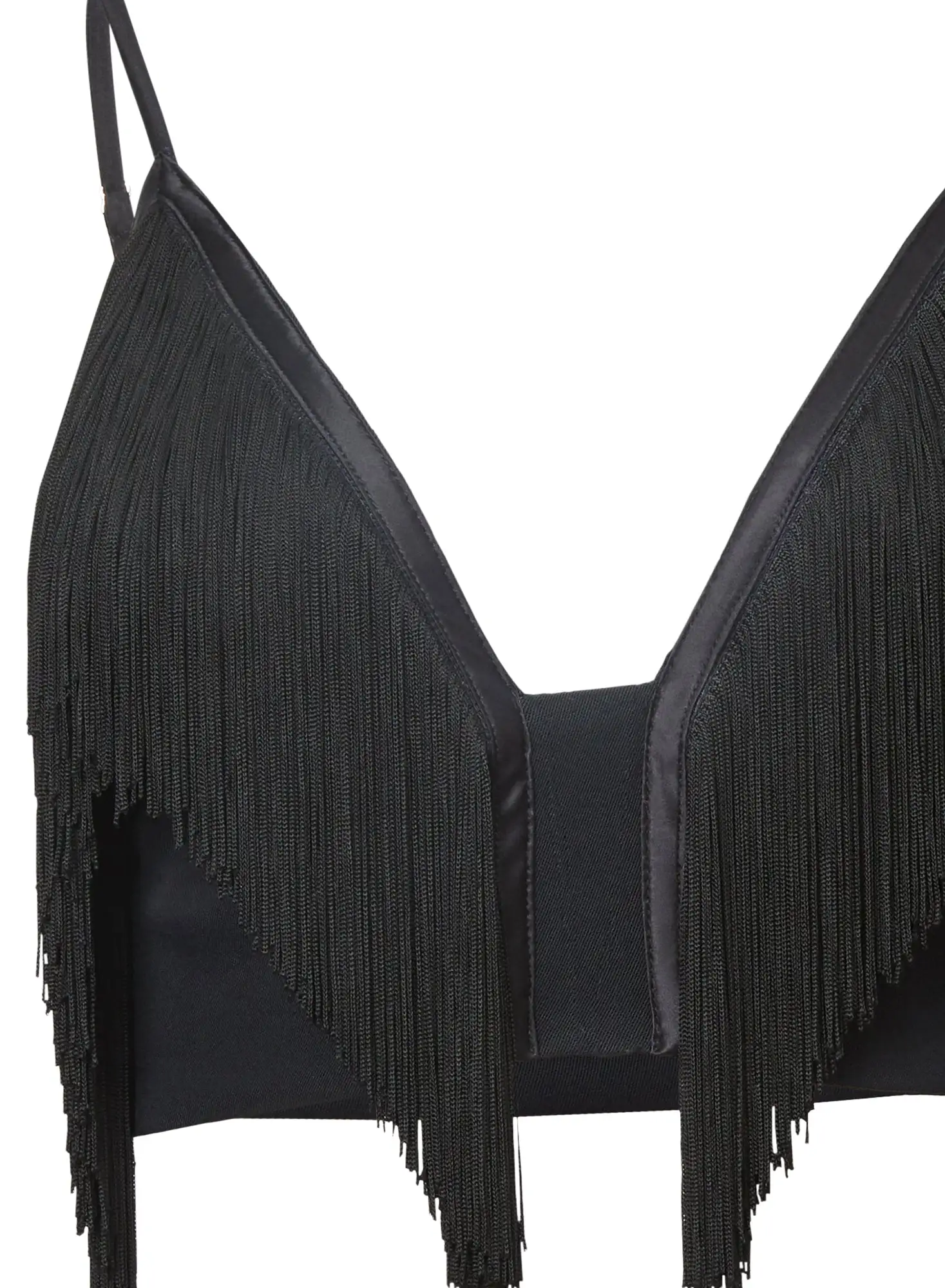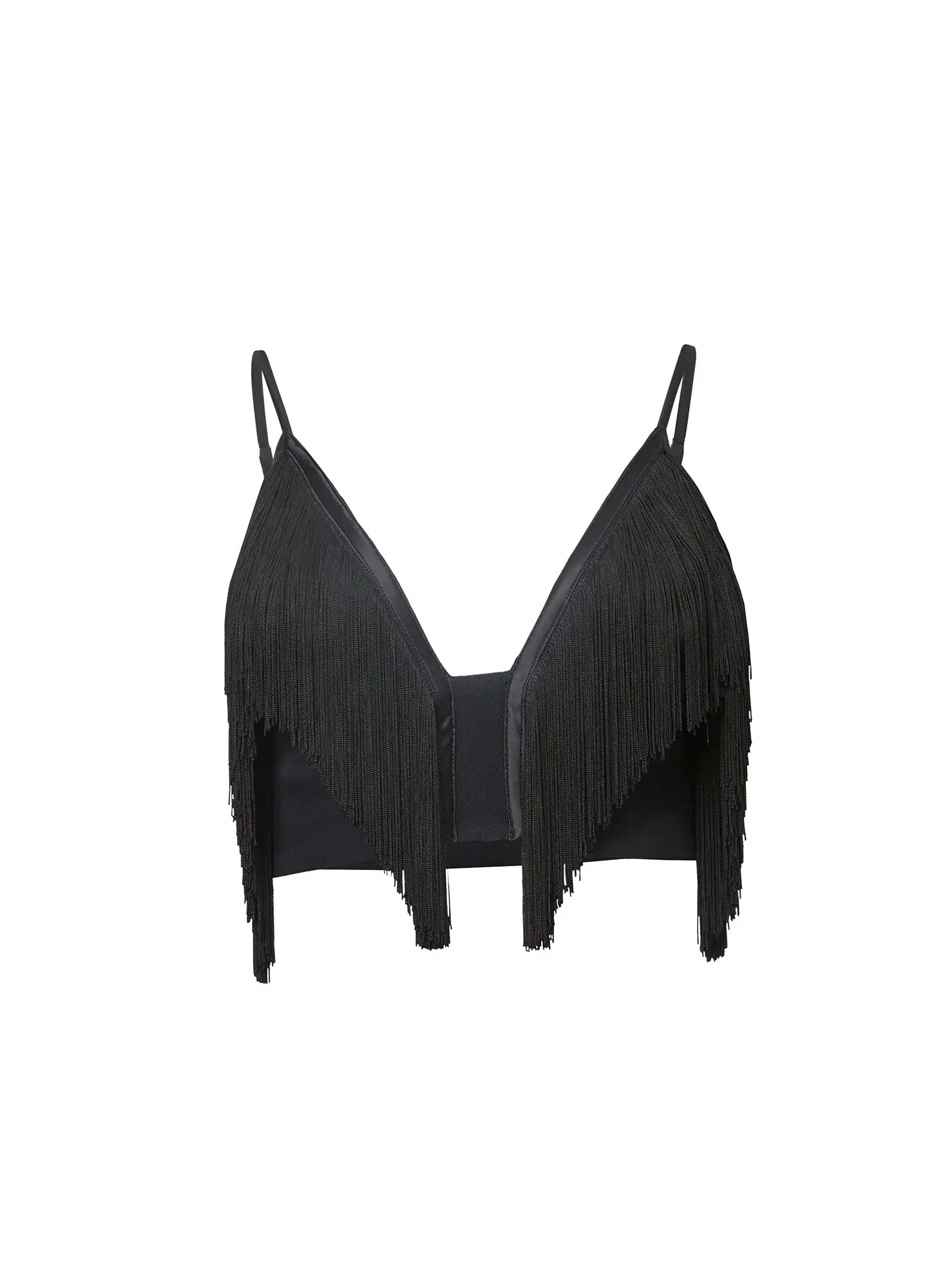 Show stopper. Our party ready Fringe Bralette features sexy deep neckline with swinging fringe embellishment detail on cups. Adjustable straps and invisible side zipper for comfort and fit. Complete this ultra flirty set with the matching Fringe Skirt.