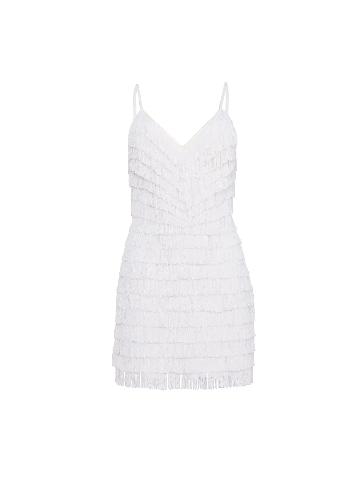 Party trick. Our show stopping Fringe Dress, featuring flirty v neckline and swinging tiered fringe embellishment. Sexy mini length with invisible zipper closure and adjustable straps. Pair with heels and your favorite Essentiels panty for a look that goes perfectly from happy hour to after hours.