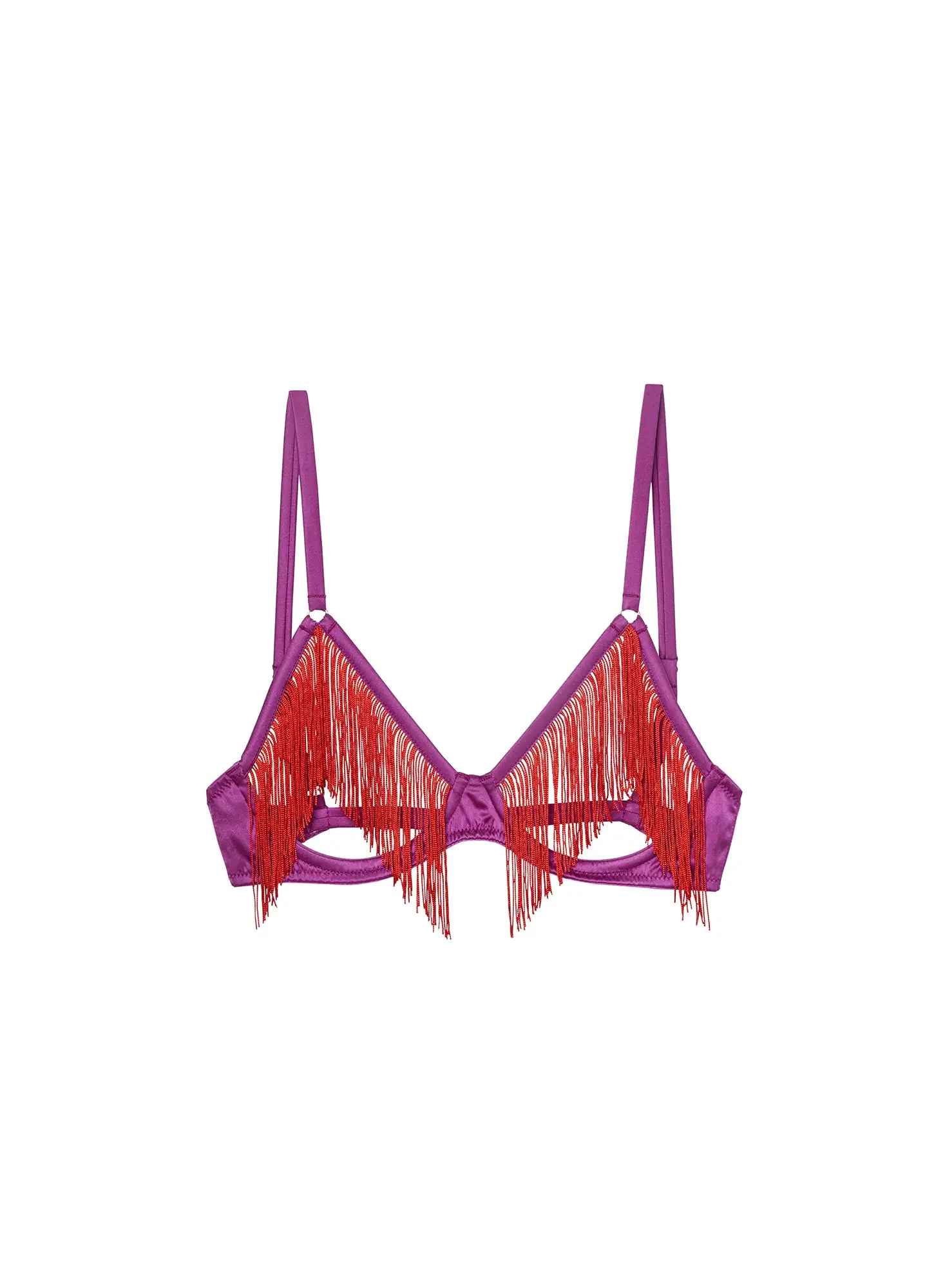 Fringe, with benefits. This ultra hot bondage bra features open, exposed cups with flirty fringe curtain. Underwire and adjustable straps provide subtle shaping and lift. Stretch silk bands with back hook closure. Complete this seriously sexy set with the matching Fringe Ouvert Heart Shaped Panty.