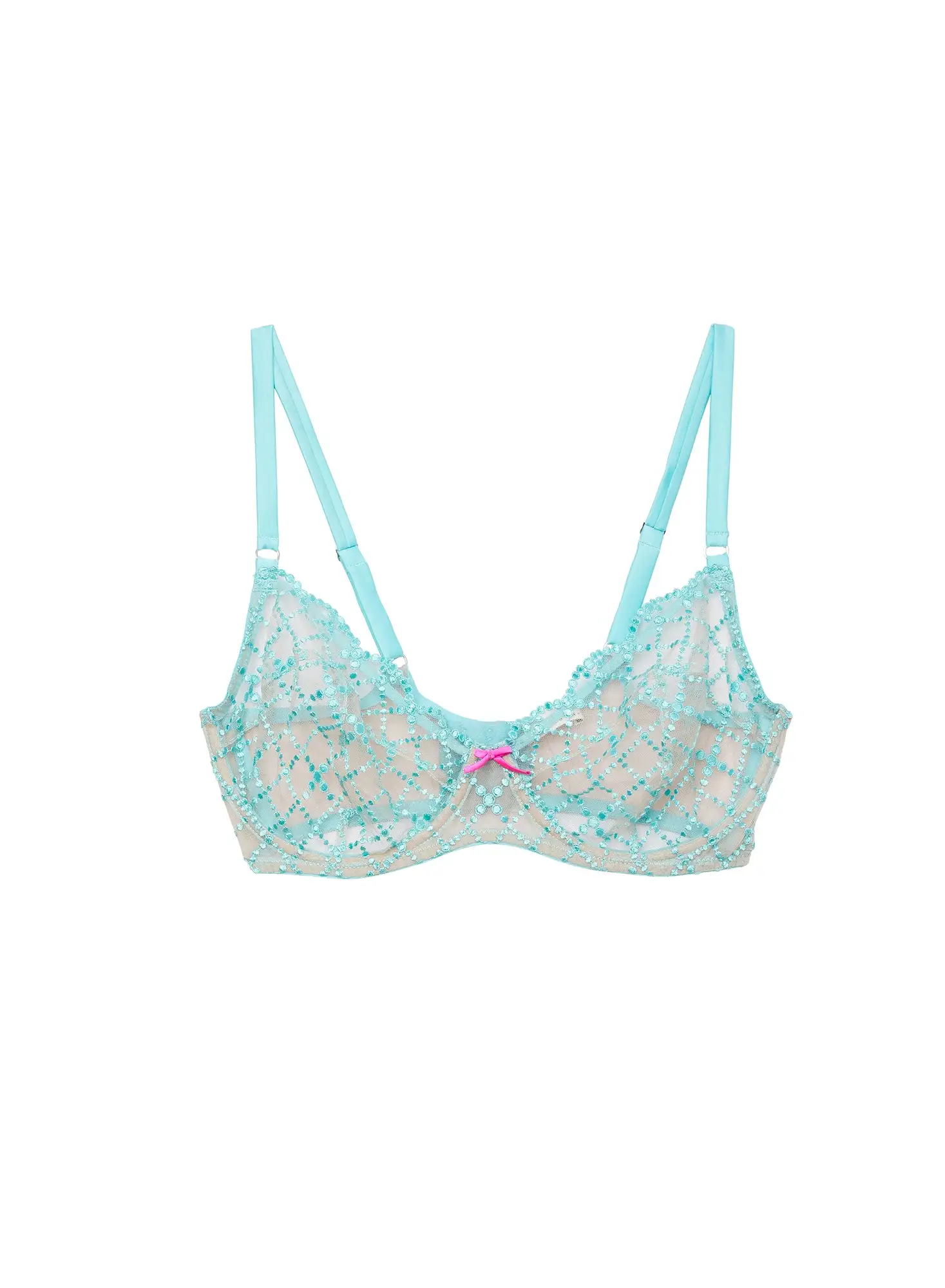 Fill me up. Our Dotty Grid Demi Bra, re-engineered for the perfect fit for extended sizes. Features beautiful embroidered dot detailing on sheer tulle. Flirty scalloped underwire cups with front bow detail. Center back closure and adjustable straps. Complete the look with the matching Dotty Grid Cheeky and Garter Belt.