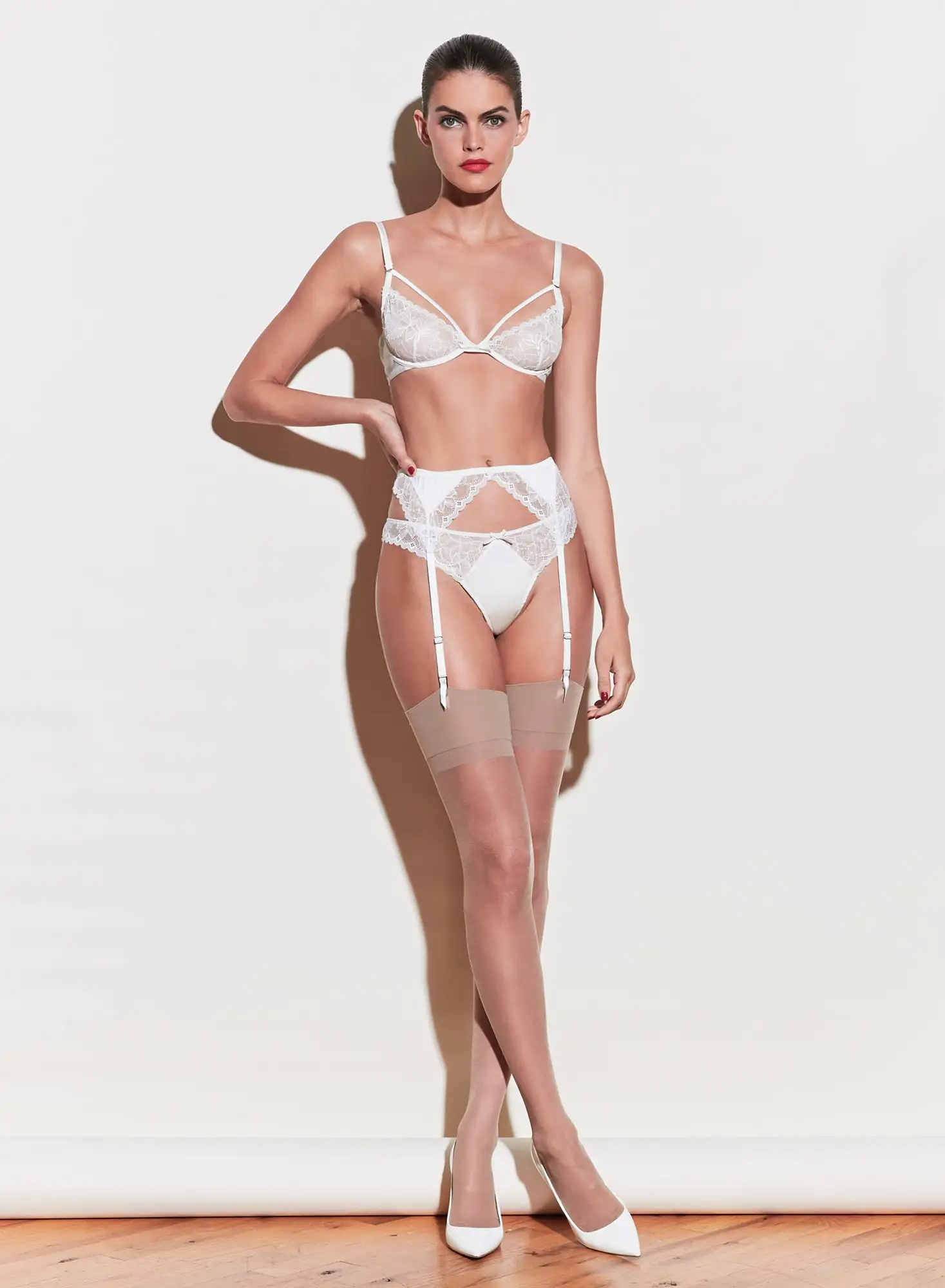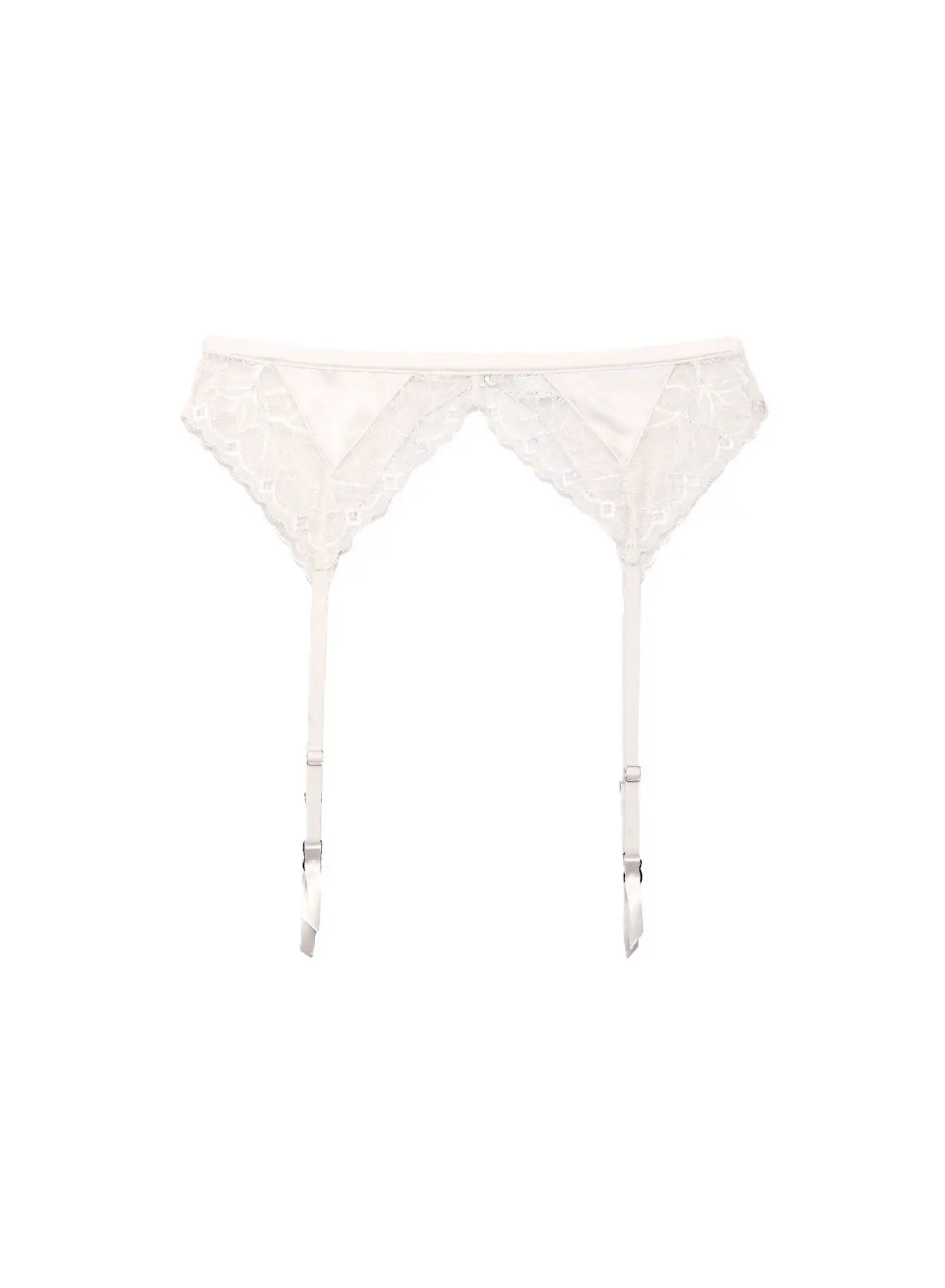 Our Gardenia Lace Garter Belt is the perfect addition to amp up your lingerie set. Features lace with black paneling at front and mesh paneling at back. Scalloped edges. Center back closure sits at waist. Pair with the matching Gardenia Lace Demi Bra and Thong for an immaculate set.