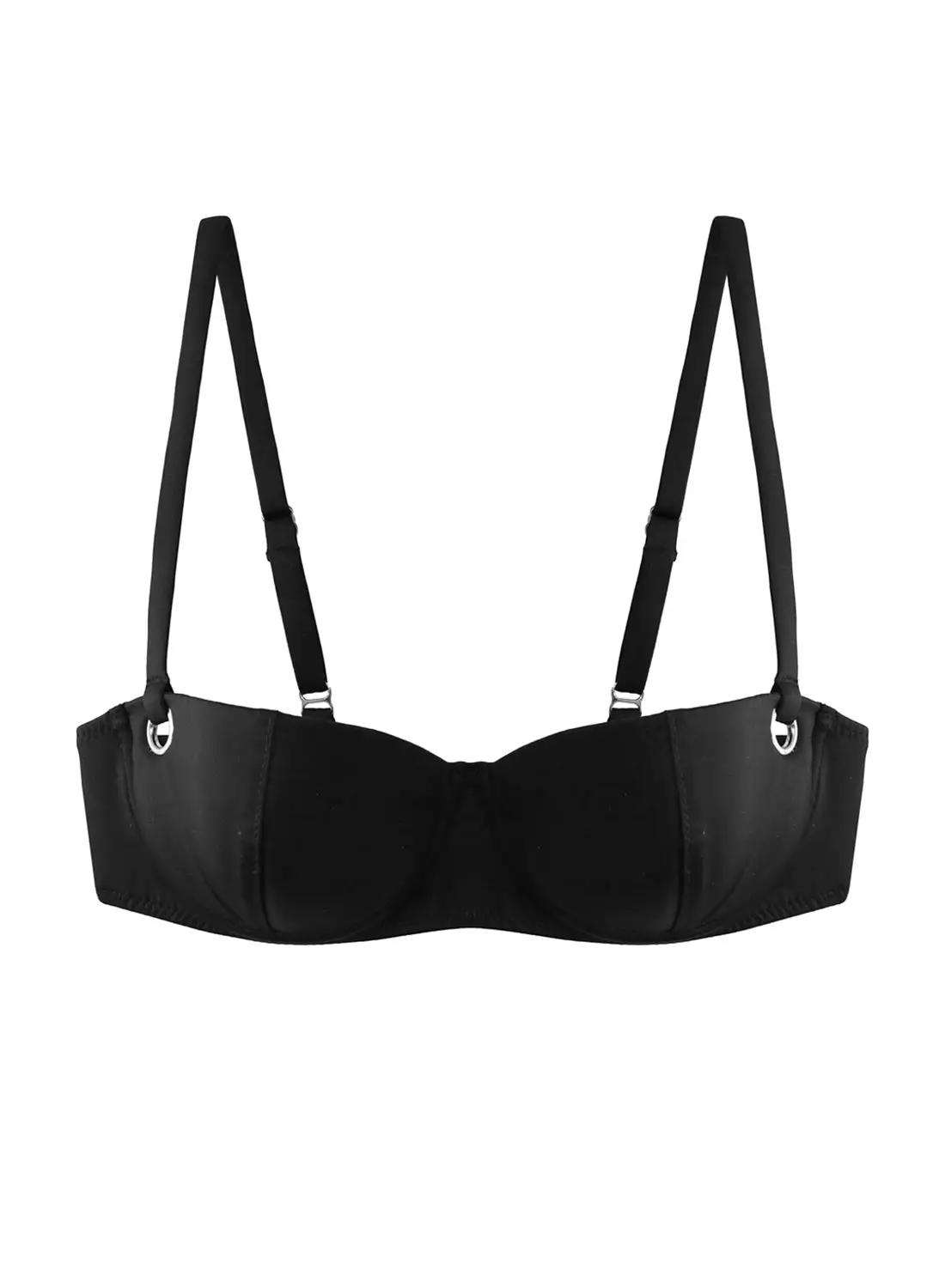 Our black Balconette Bikini Top features grommet hardware detailing. Underwire cups are slightly padded to provide the lift and shape of a balconette bra. Top stitch detail. Adjustable straps. Pair it with the High Leg Bikini Bottom with Rouching and the ivory palm Short Sleeve Robe.