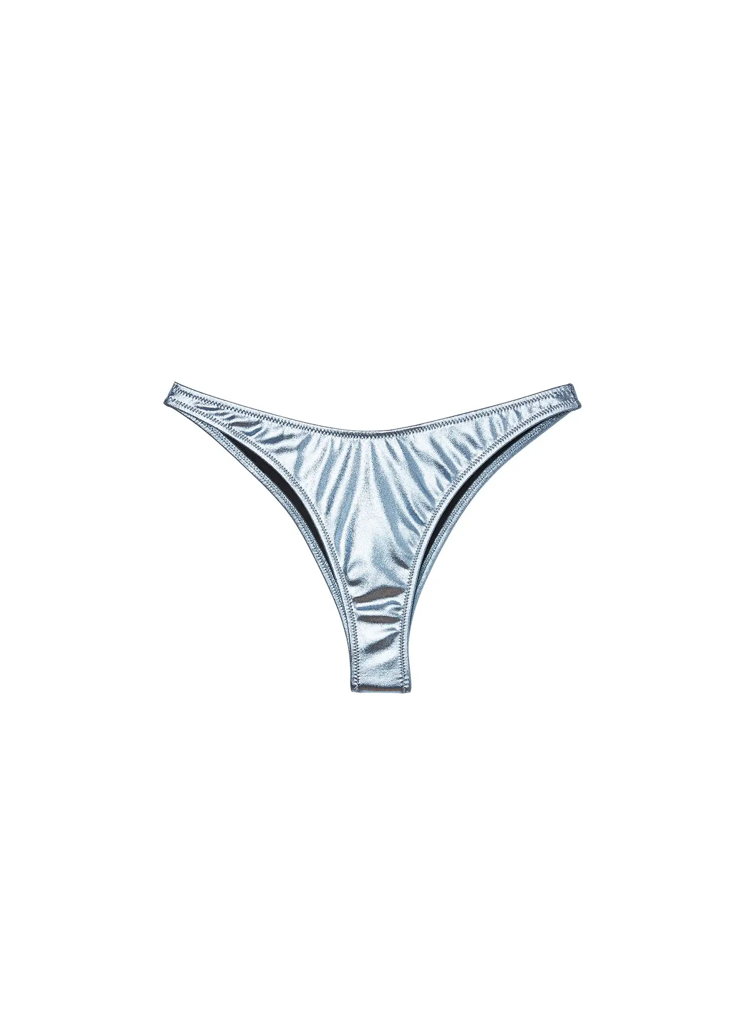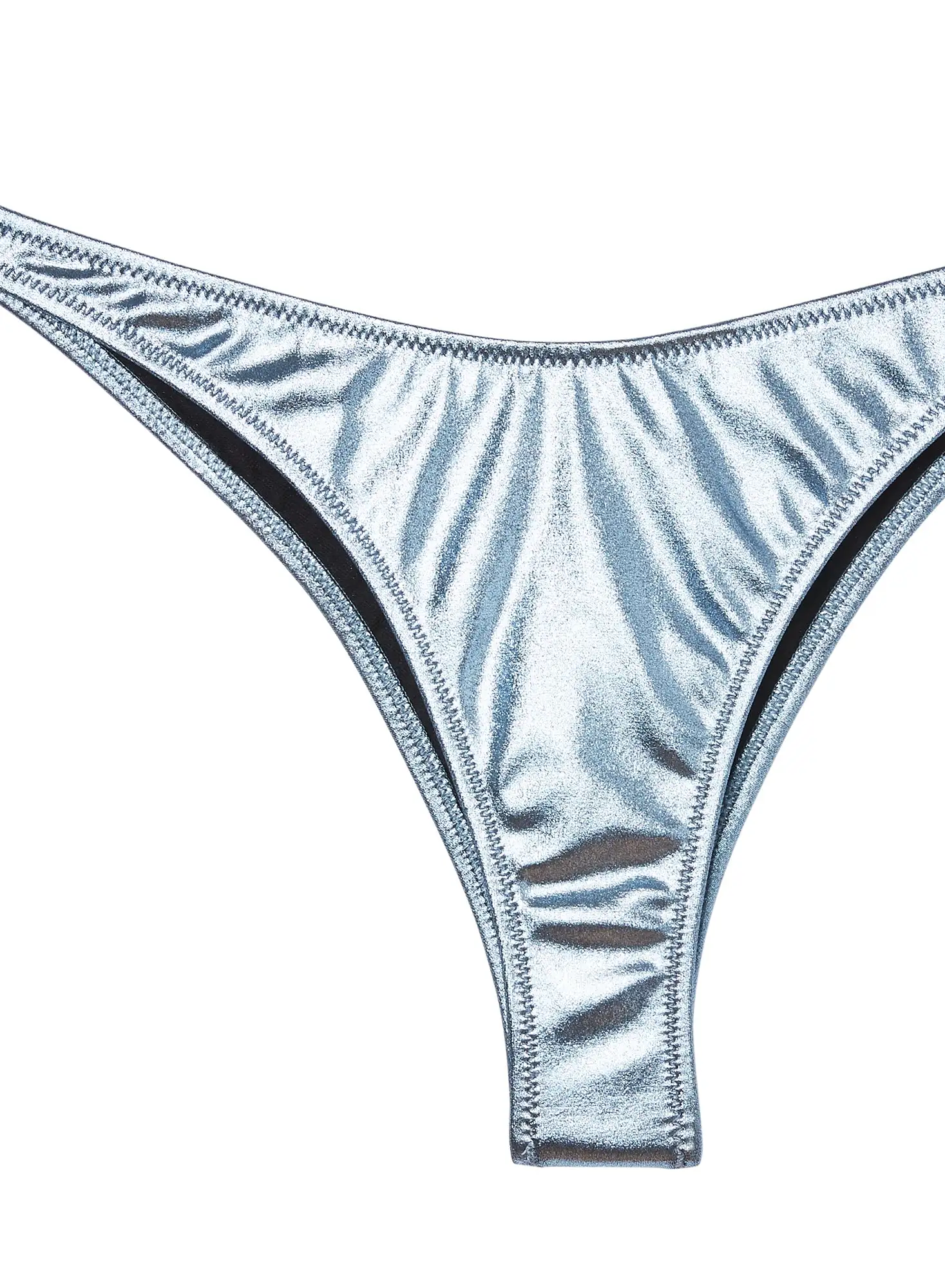 Our smokin’ hot High Leg Bikini Bottom in metallic disco ice. Stretch fabric hugs and shapes. A less is more silhouette with an ultra-cheeky cut. High leg with back keyhole which features Fleur logo engraved hardware detailing. Fully lined. Complete this stunning set with the matching Balconette Bikini Top.