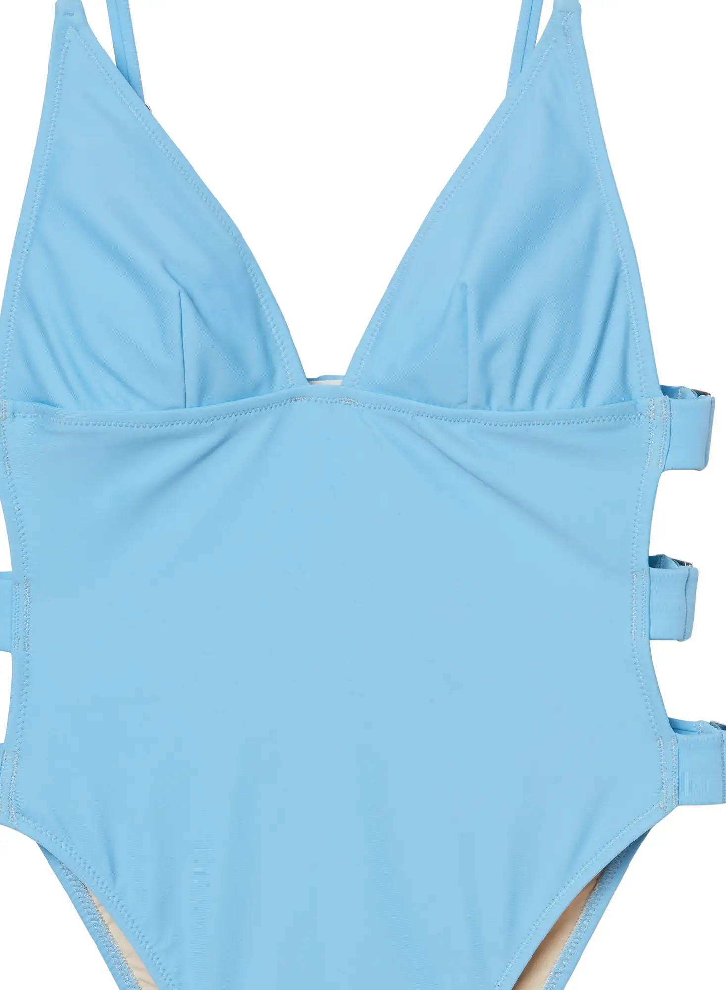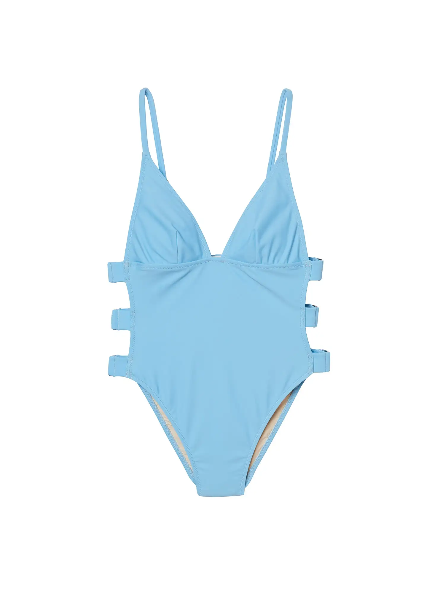 Your yacht or mine? Our High Leg Cutout One Piece is the sexiest swimsuit you’ll ever wear. Features side cutout bands with enamel rings and a deep v neckline. Italian stretch fabric shapes and holds, accentuating your waistline. Fully lined. Playful high leg cheeky cut. Can be worn seamlessly from the bar to beach when styled with our High Waist Twill Short.