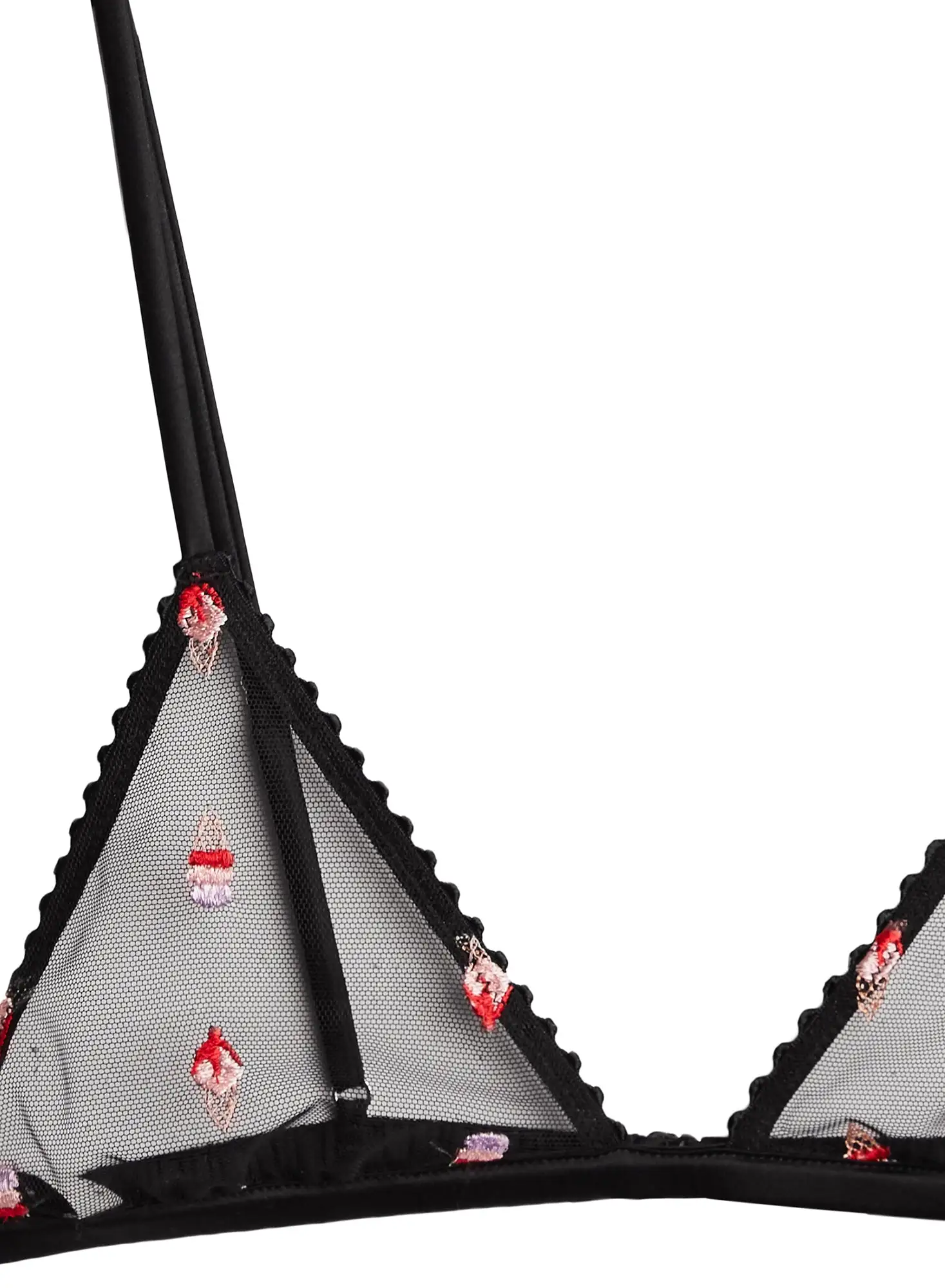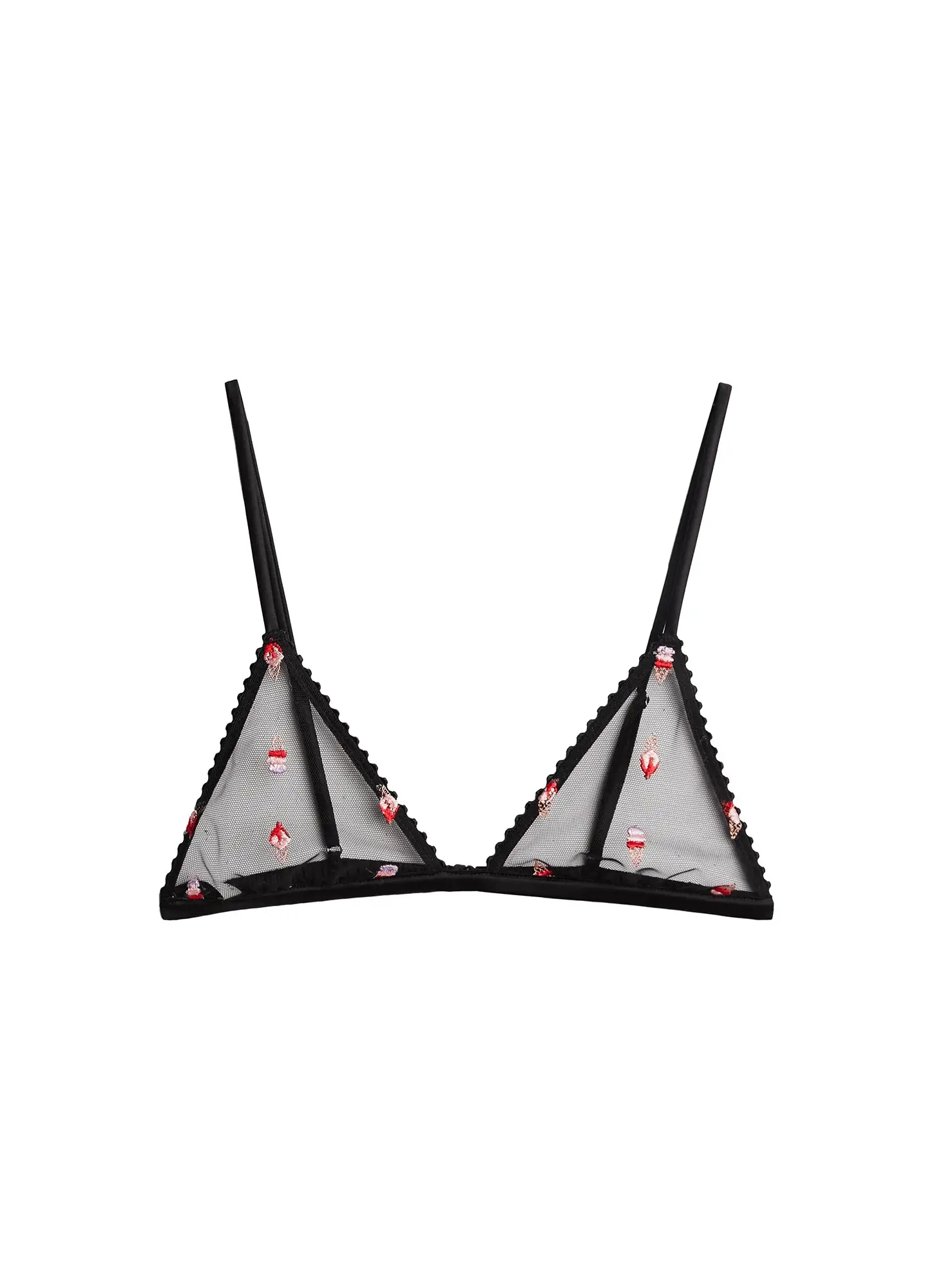 Lick it up. Our Ice Cream Embroidery Triangle Bra features playful custom ice cream cone embroidery with scalloped trim. Stretch charmeuse adjustable straps and back hook closure for the perfect customized fit. Pair with the matching Ice Cream Flavor Panty, or take it out with the Ice Cream Embroidery Wide Leg Jean.