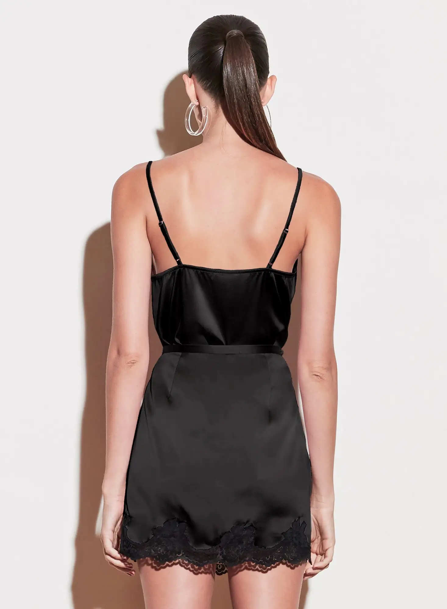 Black as night. The perfect little cami cut from luxurious stretch silk trimmed with French Leavers lace. An easy fit with adjustable spaghetti straps. Take this look from happy hour to after hours with the matching James Lace Slip Skirt.