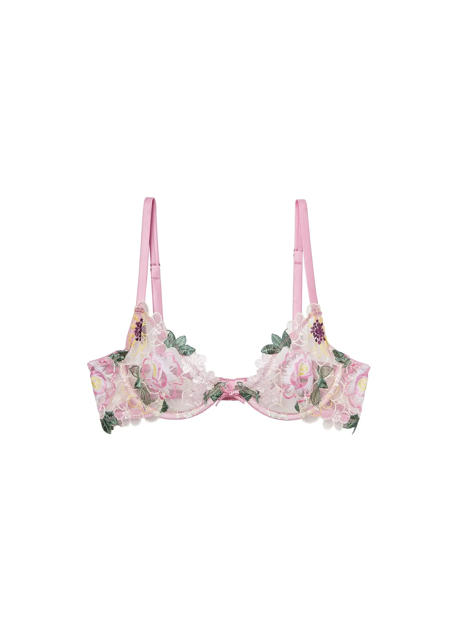 Better than a bouquet. Our Jardin Embroidery Demi Bra features delicate, custom floral embroidery with ultra flirty scalloped edge. Underwire cups with silk covered adjustable straps provide subtle shaping and lift. Back hook and eye closure for the perfect fit. Unlined. Complete this intoxicating bedroom set with the matching Jardin Embroidery Thong and Garter.