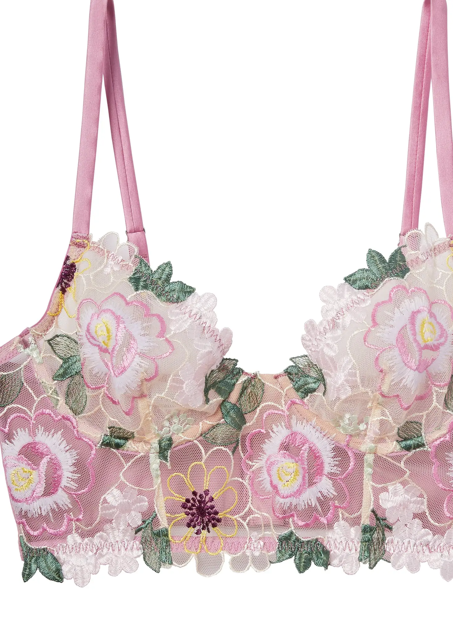 Floral notes. Our Jardin Embroidery Longline Demi Bra features delicate, custom floral embroidery with ultra flirty scalloped edge. Underwire cups and boning provide subtle shaping and lift, with jersey back panels for comfort and fit. Exposed back zipper and silk covered adjustable straps. Unlined. Wear as a bra top with your favorite boyfriend jeans, and complete the set with the matching Jardin Embroidery Thong.