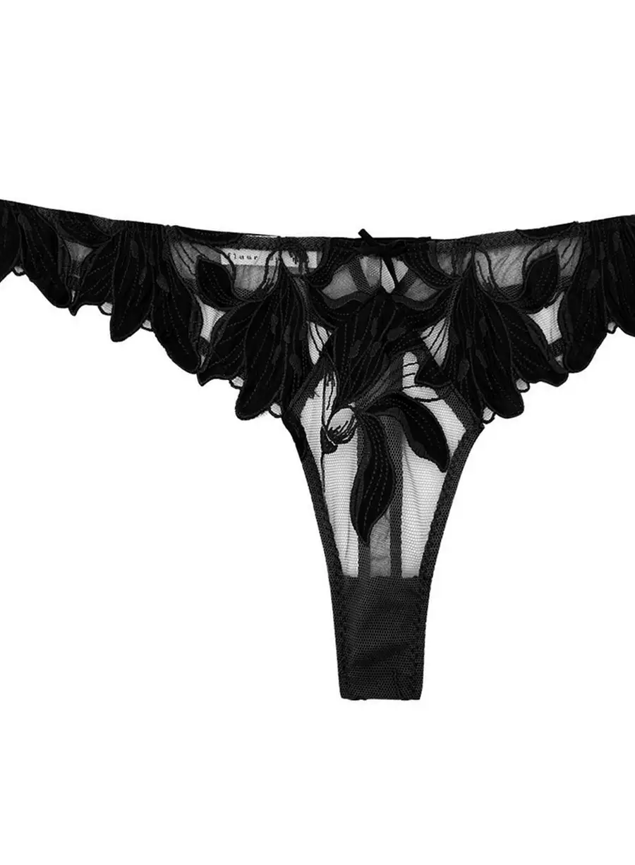 Our signature Lily Embroidery Hipster Thong in classic black. Features large embroidered lilies with flirty scalloped edges and mesh back. Pair it back to the matching Lily Embroidery Plunge Demi and Garter.
