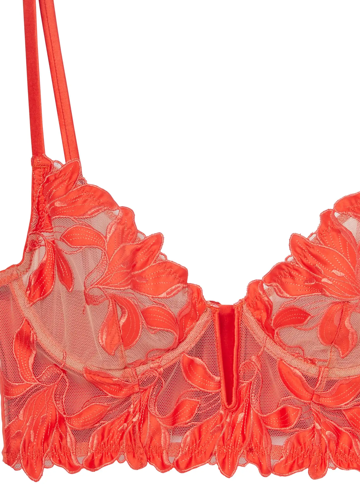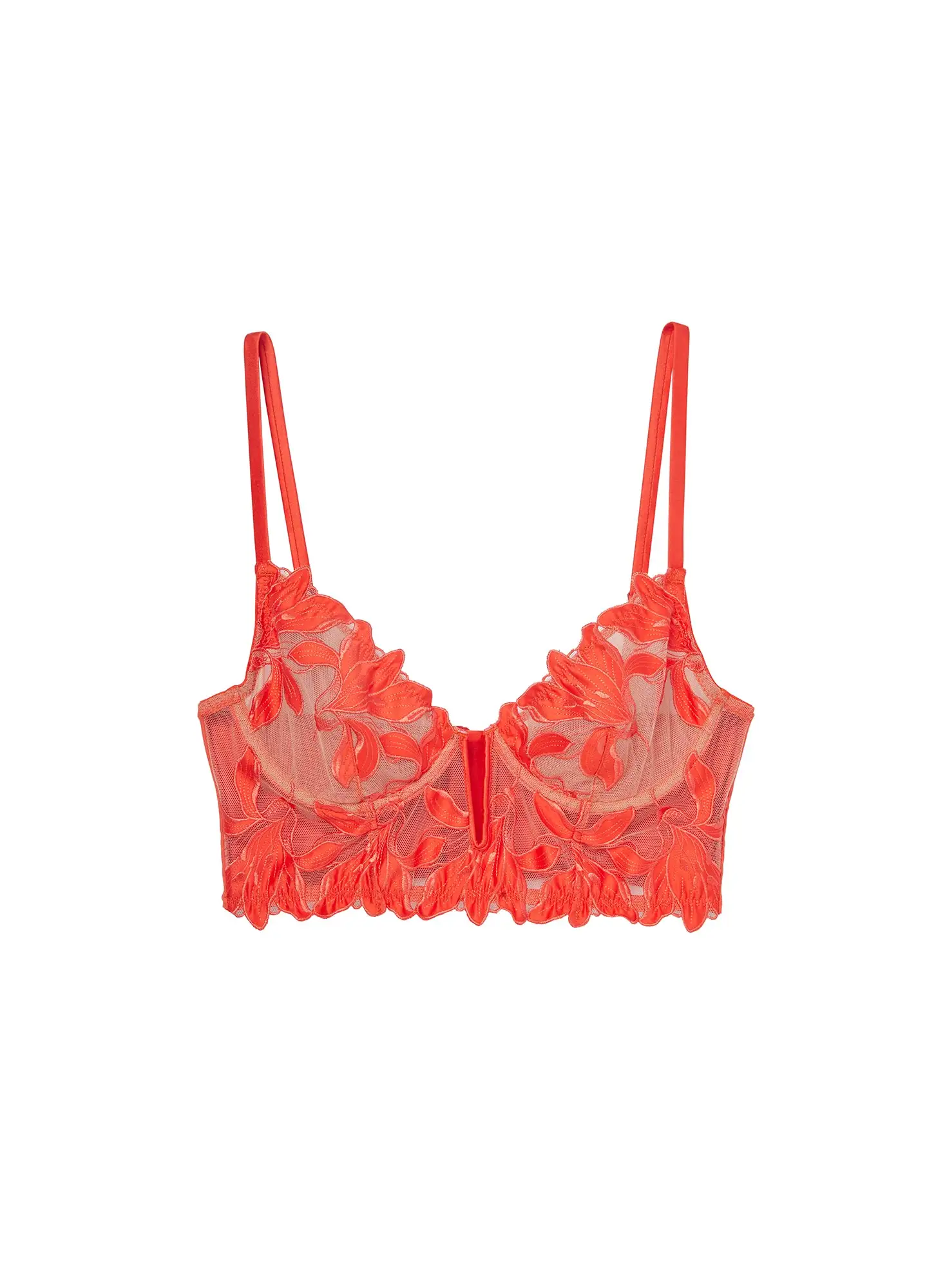 Longing for you. Our Lily Embroidery Longline Demi Bra is our favorite bra top. Floral embroidery lined with stretch mesh across cups and bodice. Underwire with adjustable straps. Boning throughout. Complete the set with the matching Lily Embroidery Thong and Garter.
