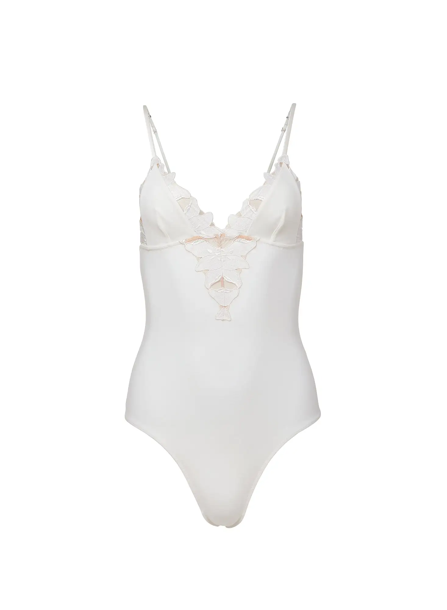 Our Lily Embroidery bodysuit features a beautiful embroidery-trimmed neckline and thong cut back. Soft stretch ponti jersey, elastic under bust for support. Bottom snap closure, adjustable straps. Looks effortlessly chic with a pair of jeans or with our Bedroom to Boardroom Pant.