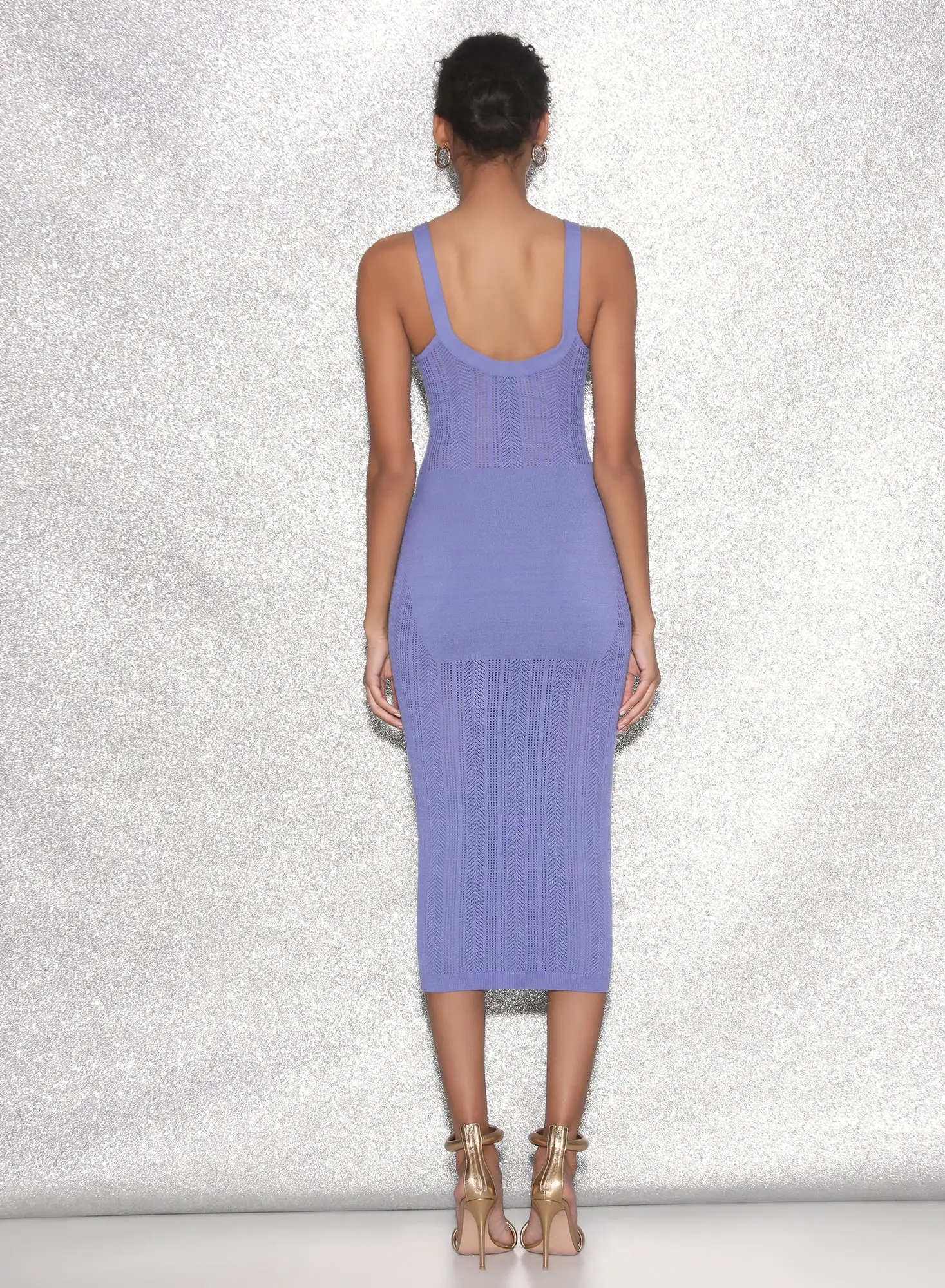 Tighten up. Our Linear Pointelle Knit Dress, cut from soft stretch knit that hugs your body in all the right places. Features semi sheer pointelle striping with solid top and bottom panels for coverage. Flattering scoop neckline, midi length. Layer over your favorite Essentiels panty for a chic look that will take you from happy hour to after hours.