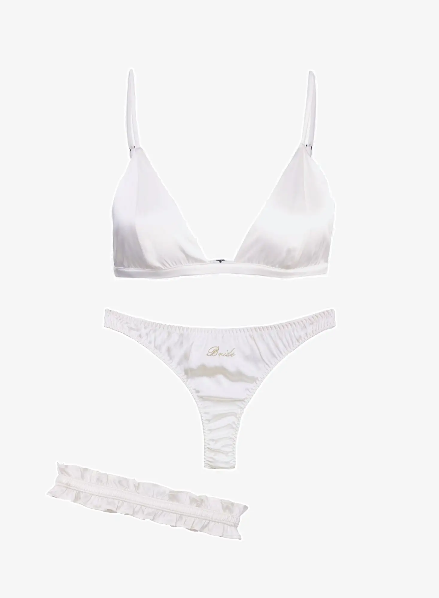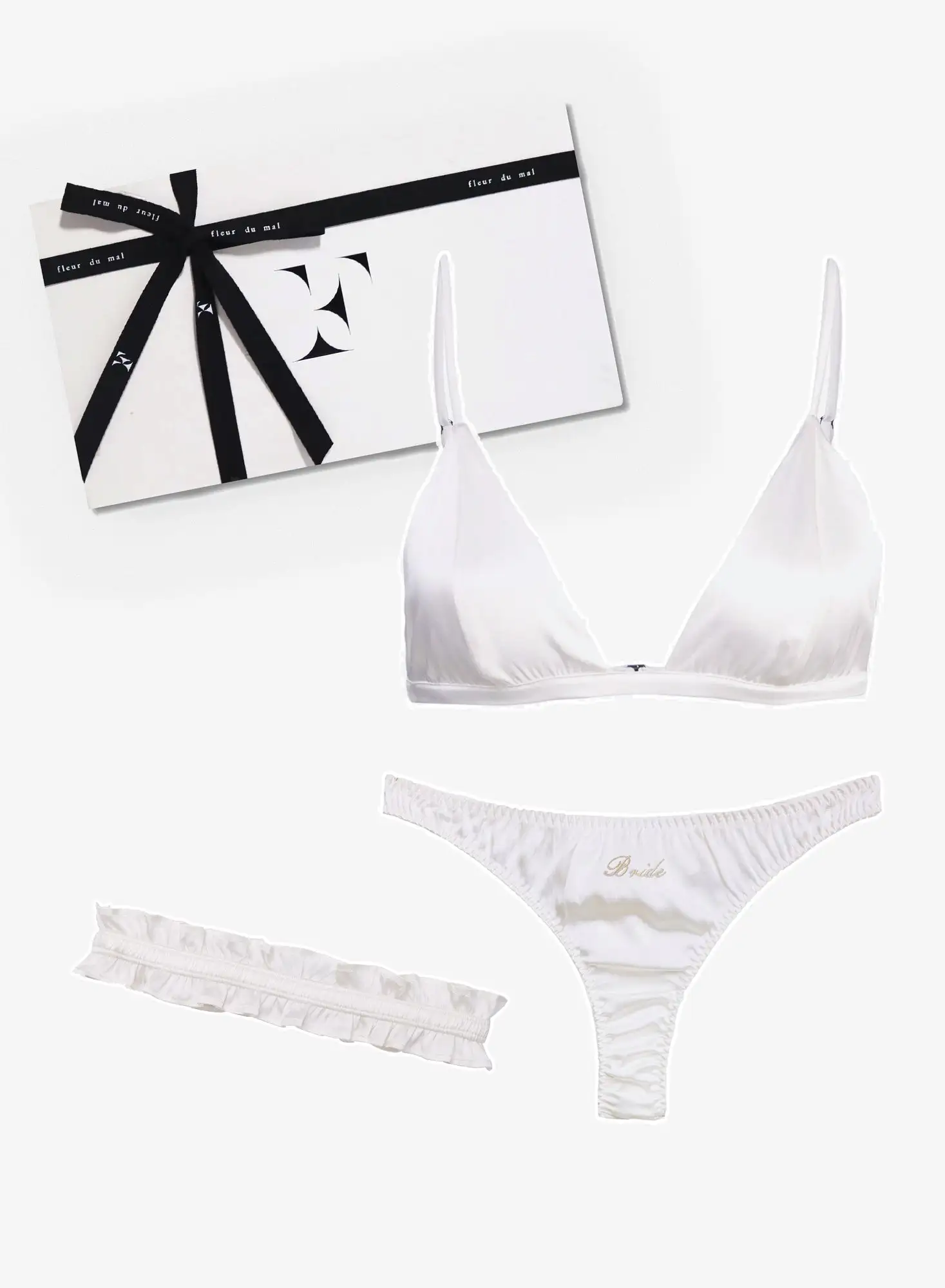 White hot wedding. Our Luxe Bridal Gift Set has everything she needs. Features our best selling Luxe Thong with special “Bride” embroidery on front. Matching Luxe Triangle Bra and new Luxe Bridal Garter complete the set. Beautifully gift wrapped in Fleur logo box with a black ribbon.