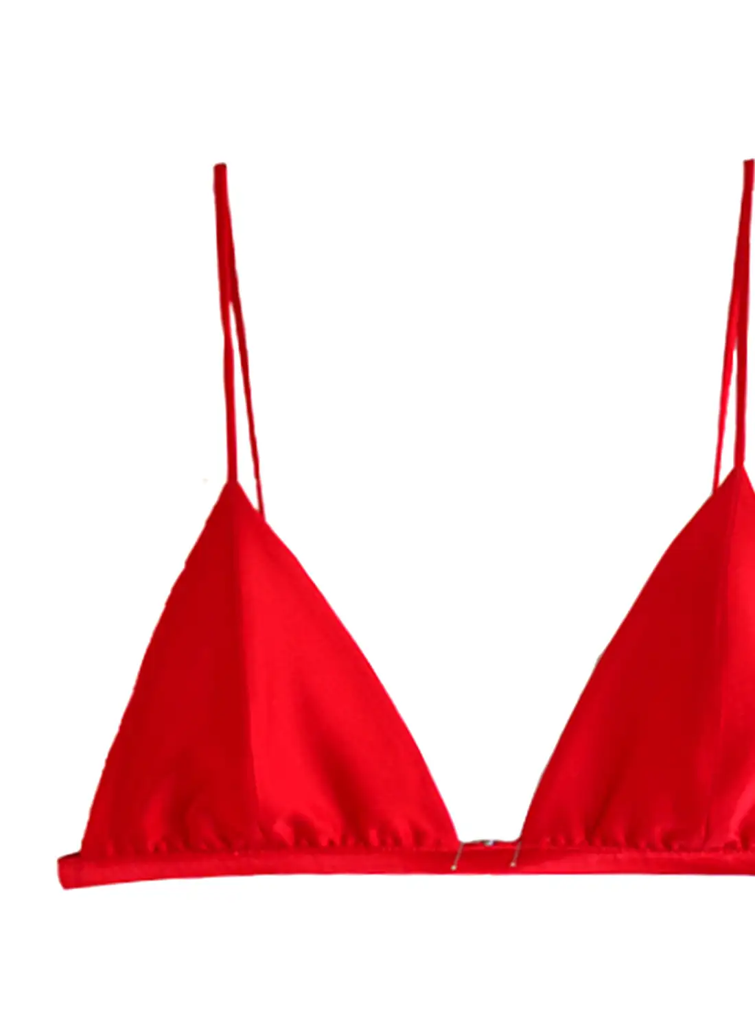 Stretch silk satin triangle bra with smooth band and silk lined cups. Perfect under a tee, as a luxe everyday bra, or worn by itself as a top under a blazer. Back hook closure and adjustable straps. Complete the look with the Luxe V-String.