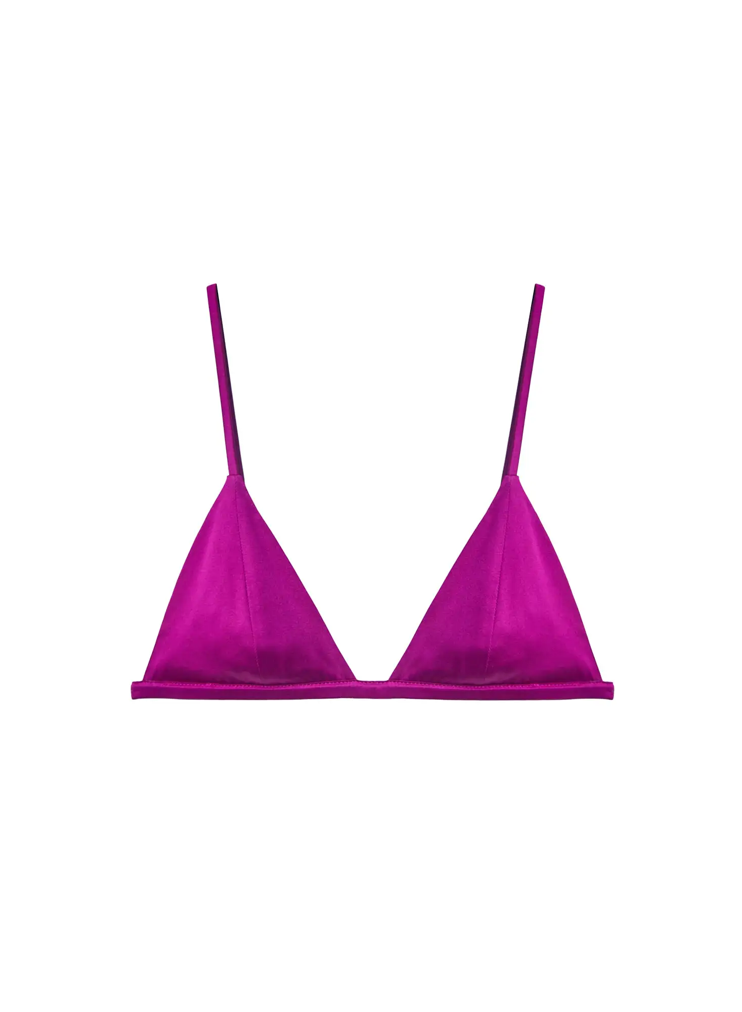 Our best selling, stretch silk satin Luxe Triangle Bra in vixen with a smooth band and silk lined cups. Perfect under a tee, as a luxe everyday bra, or worn by itself as a top under a blazer. Back hook closure and adjustable straps. Complete the set with the matching Luxe Thong or Luxe V String.