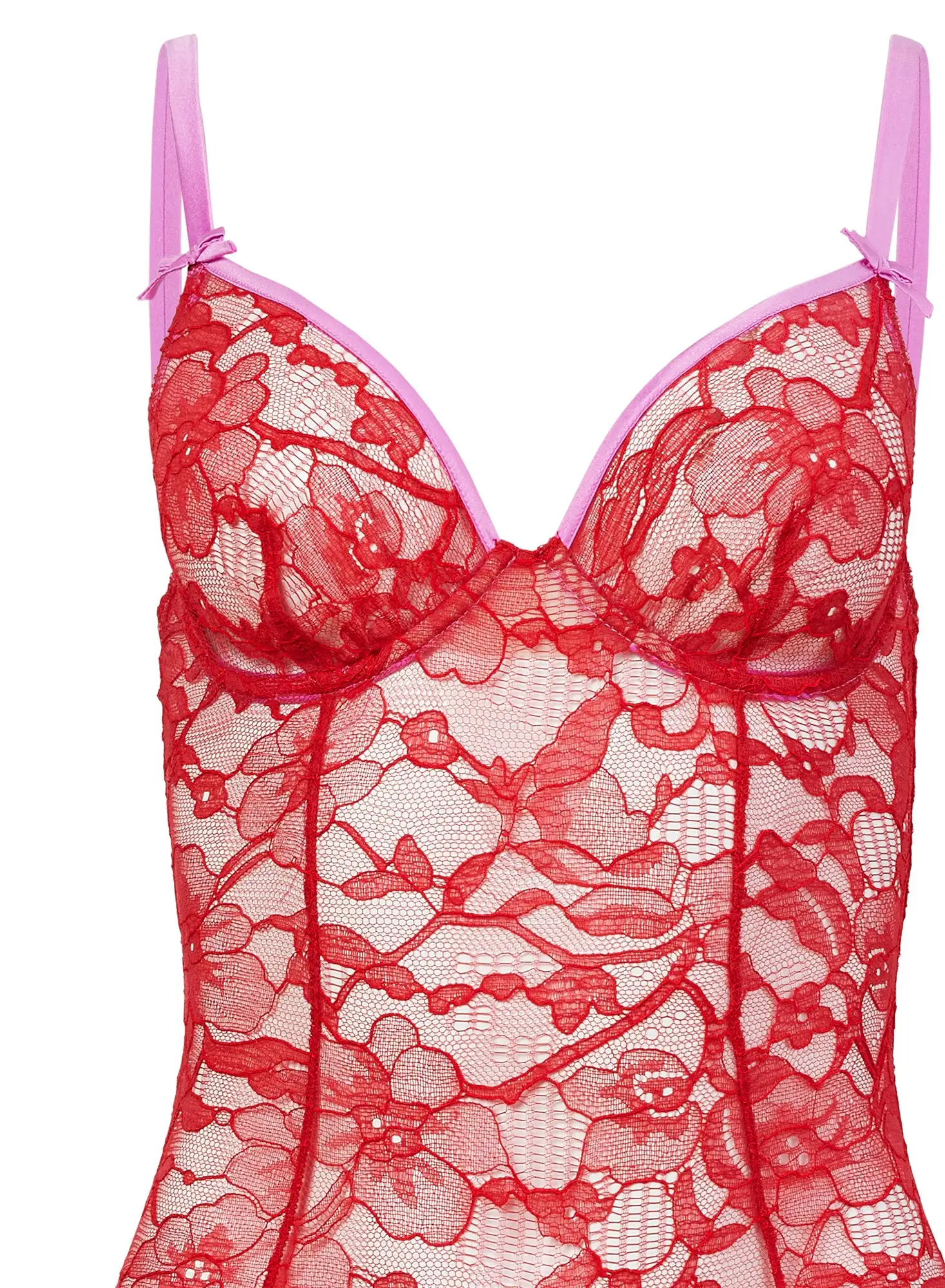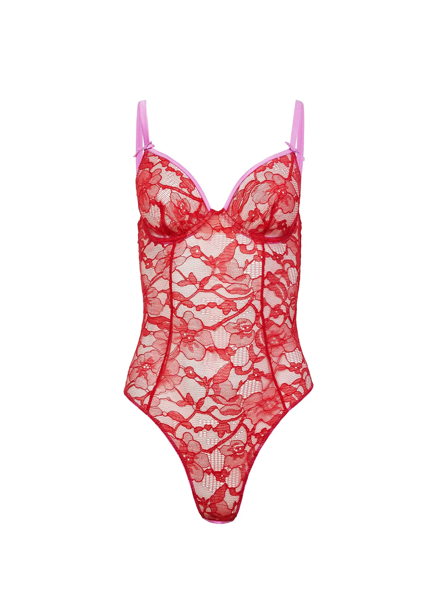 Seriously sexy. Our Magnolia Lace Ouvert Bodysuit in stunning stretch French Leavers lace. Features underwire cups for support, plus adjustable straps for a customized fit. Crotchless with open back. Pair with thigh highs for an unforgettable after dark look.