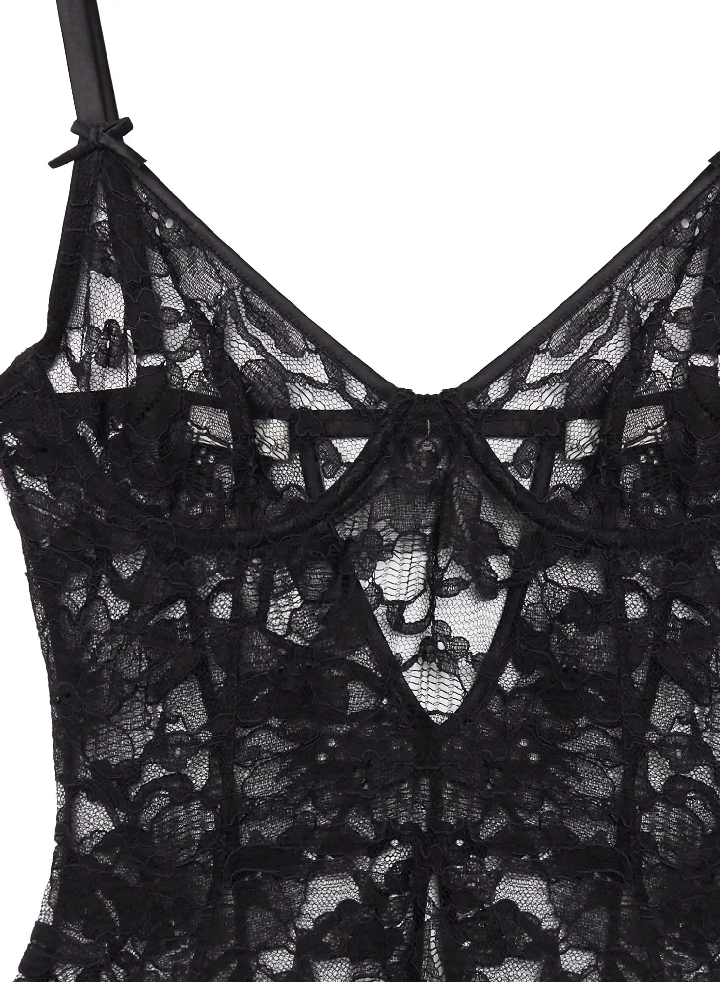 Seriously sexy. Our Magnolia Lace Ouvert Bodysuit in stunning stretch French Leavers lace. Features underwire cups for support, plus adjustable straps for a customized fit. Crotchless with open back. Pair with thigh highs for an unforgettable after dark look.