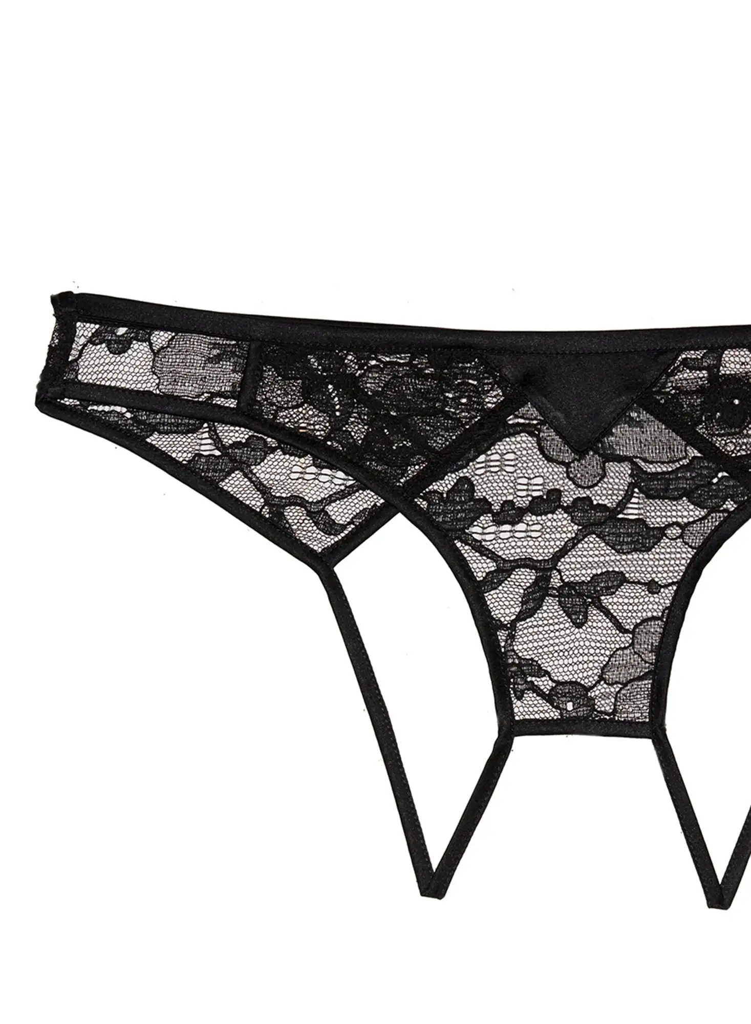 Risqué business in the front, party in the back. Our Magnolia Lace Ouvert Panty, cut from stunning stretch, French leavers lace. Crotchless with an open back. Complete this seriously sexy set with the Magnolia Lace Unlined Demi Bra.
