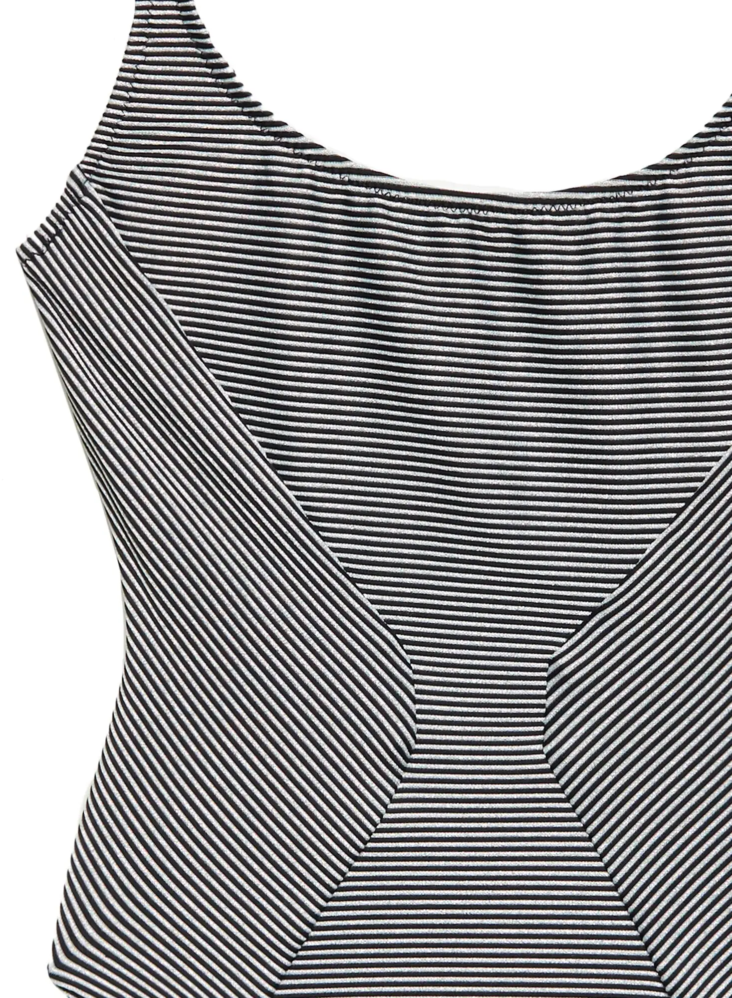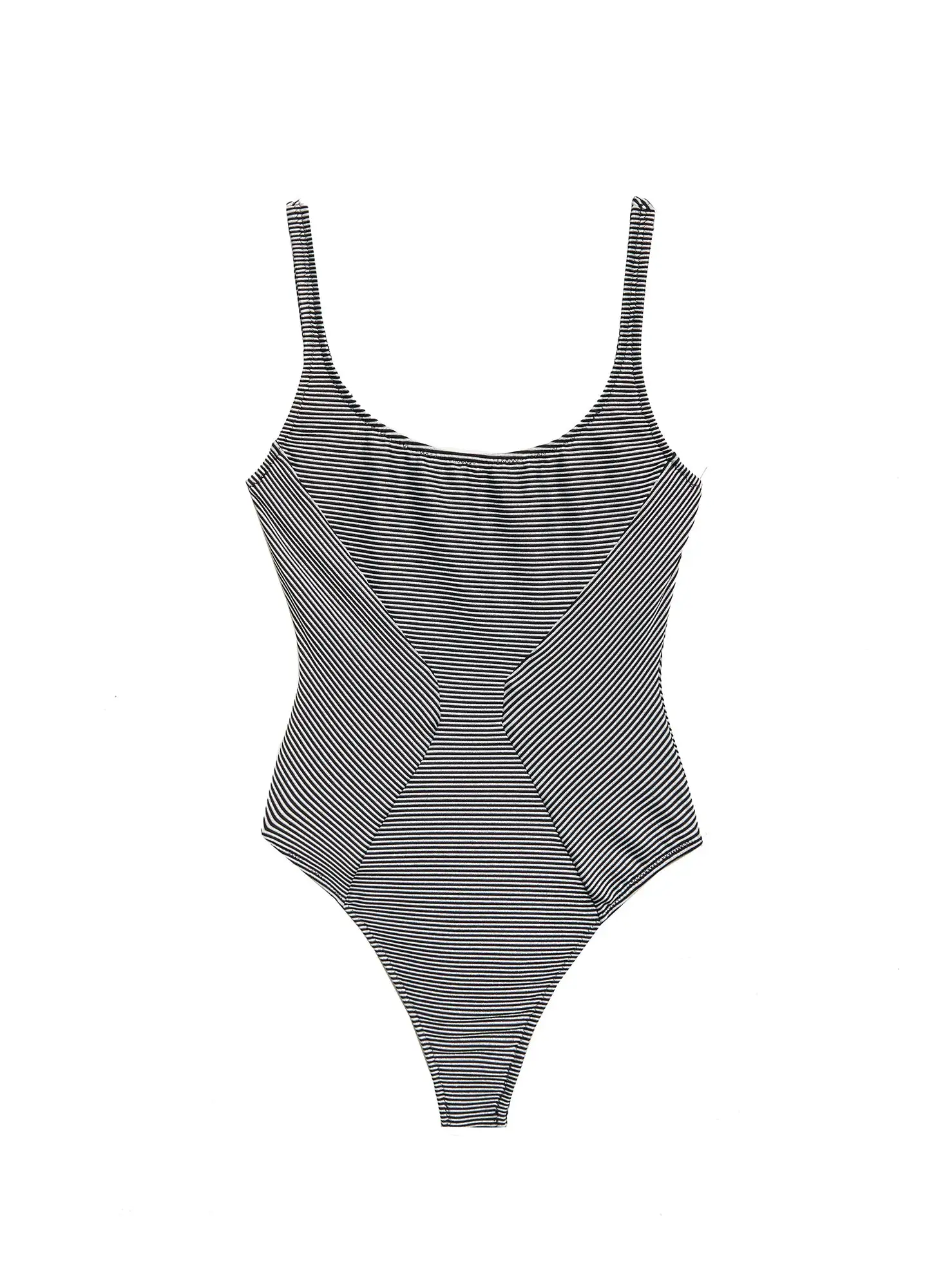 Get in my corner. Our Mitered Stripe Scoop Neck One Piece cut from Italian stretch fabric that retains shape and holds you in. Features deep scoop front and back with ultra flattering mitered stripe pattern to accentuate your figure. Fully lined. Looks chic with the Washable Silk Wrap Robe.