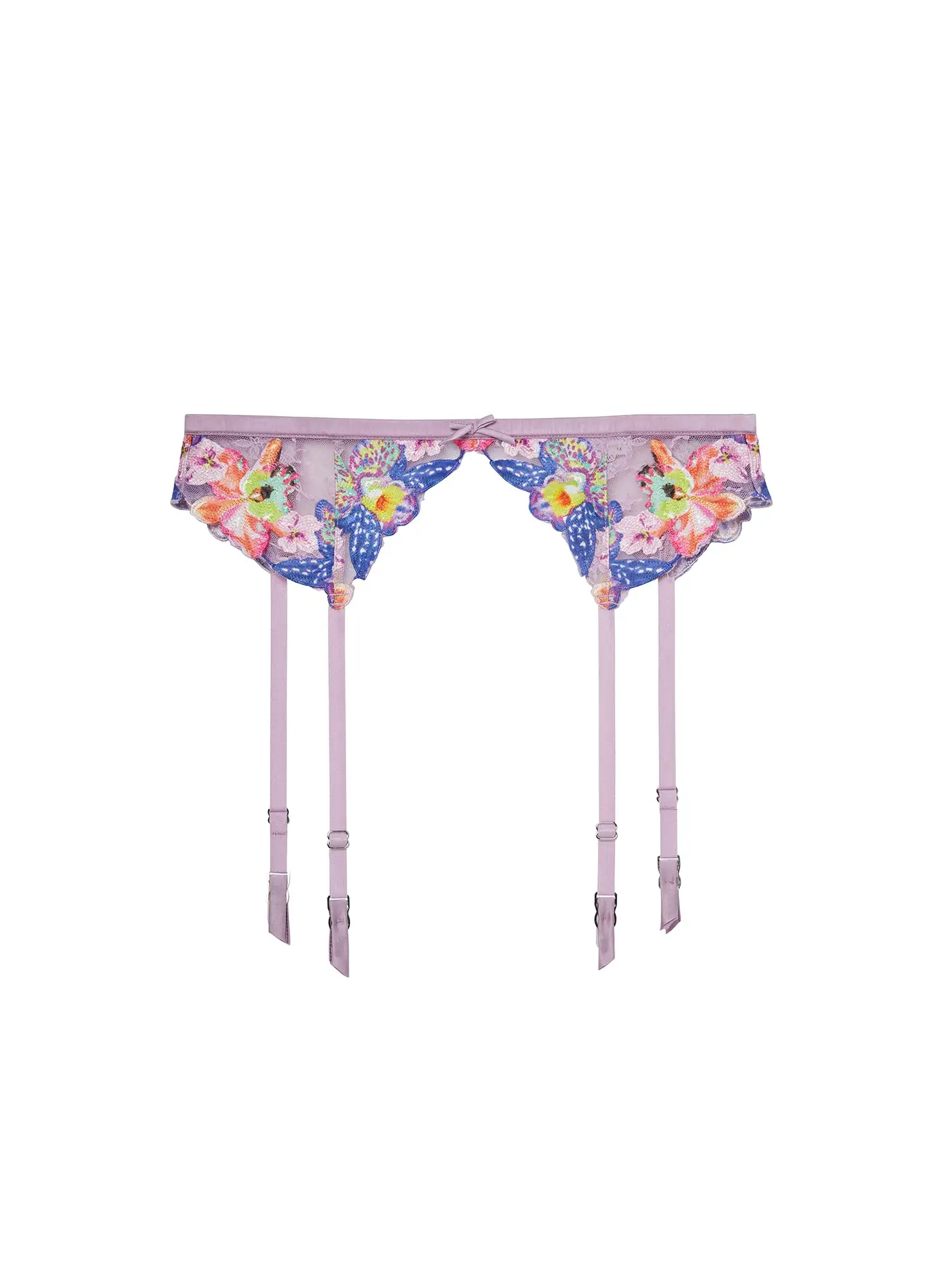 Your exotic flower. Our Orchid Embroidery Garter is the perfect addition to amp up your lingerie set. Features custom neon printed floral embroidery on pastel lace. Silk covered adjustable garter straps and elastic waistband. Center back closure sits at waist. Pair with the matching Orchid Embroidery Balconette and Thong.