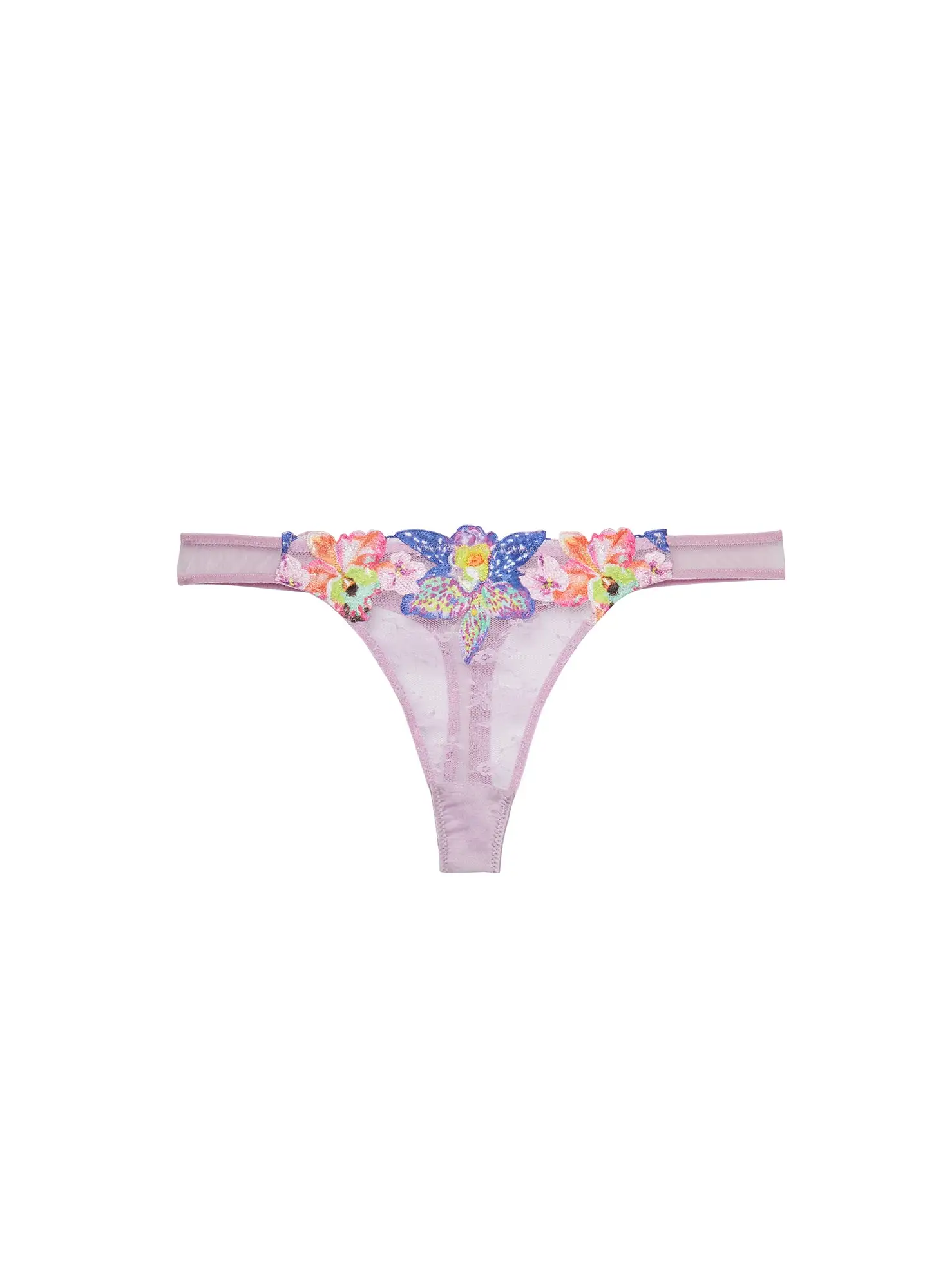 In full bloom. Our Orchid Embroidery Thong with stunning neon printed embroidered silk on pastel lace. Ultra flirty mesh back with embroidered detail. Complete this intoxicating set with set with the matching Orchid Embroidery Balconette and Garter.