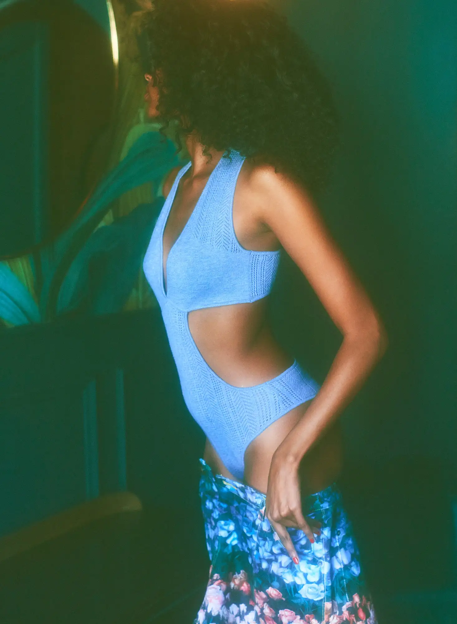 Side to side. Our Pointelle Cutout Bodysuit, cut from soft stretch knit that hugs your body in all the right places. Features flattering low cut neckline with side cutouts and linear pointelle detailing. Bottom snap closure. Looks effortlessly chic with jeans, or paired with our Rose Stripe Denim Mini Skirt.