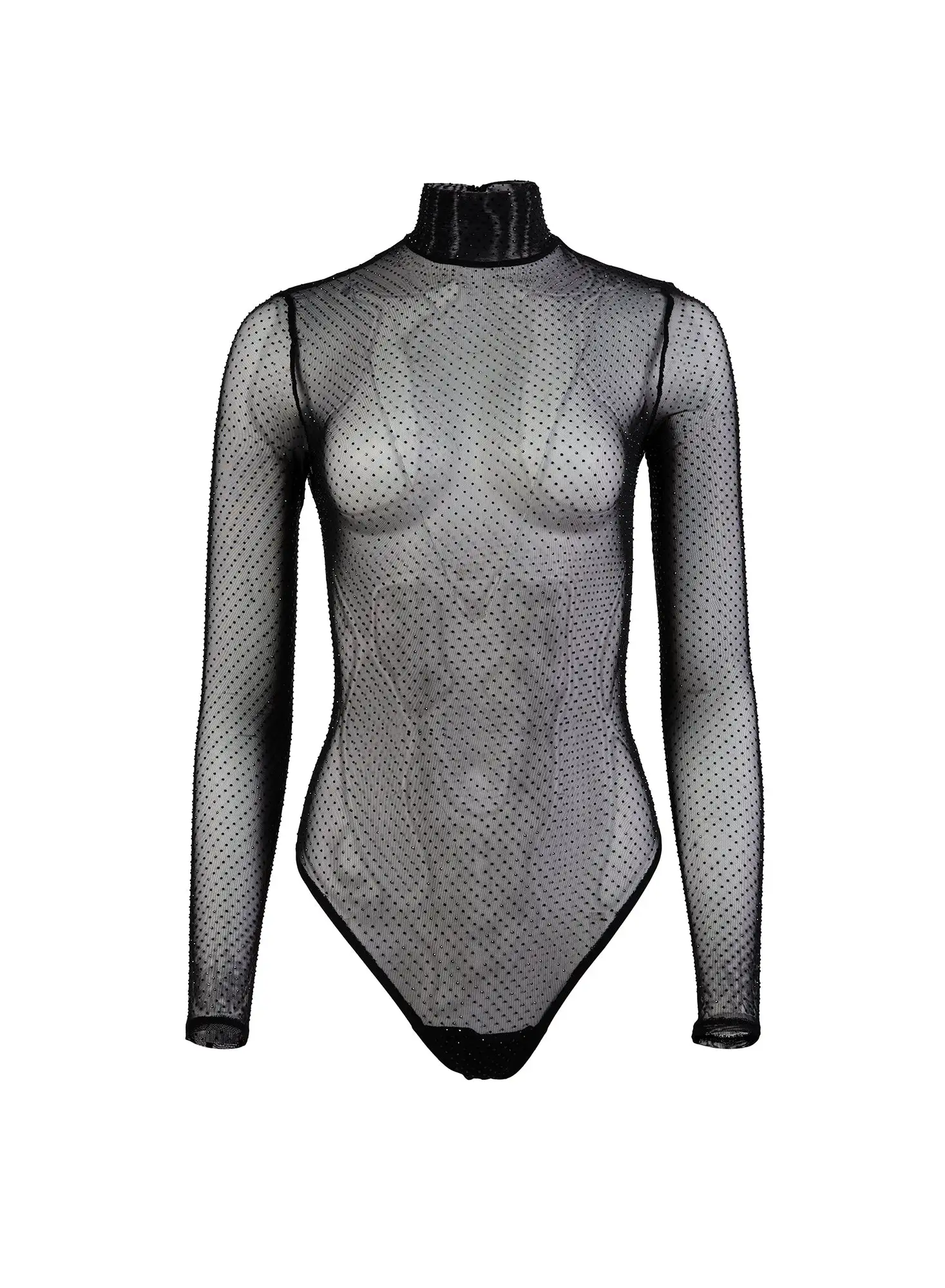 Meet me on the dance floor. Our ultra glam Rhinestone Bodysuit. This sheer mesh bodysuit features allover crystal rhinestones to catch the light – and their eye – from across the room. Back zipper closure with snap gusset. Take it out layered over the Luxe Triangle Bra and V String, or flaunt all on its own.