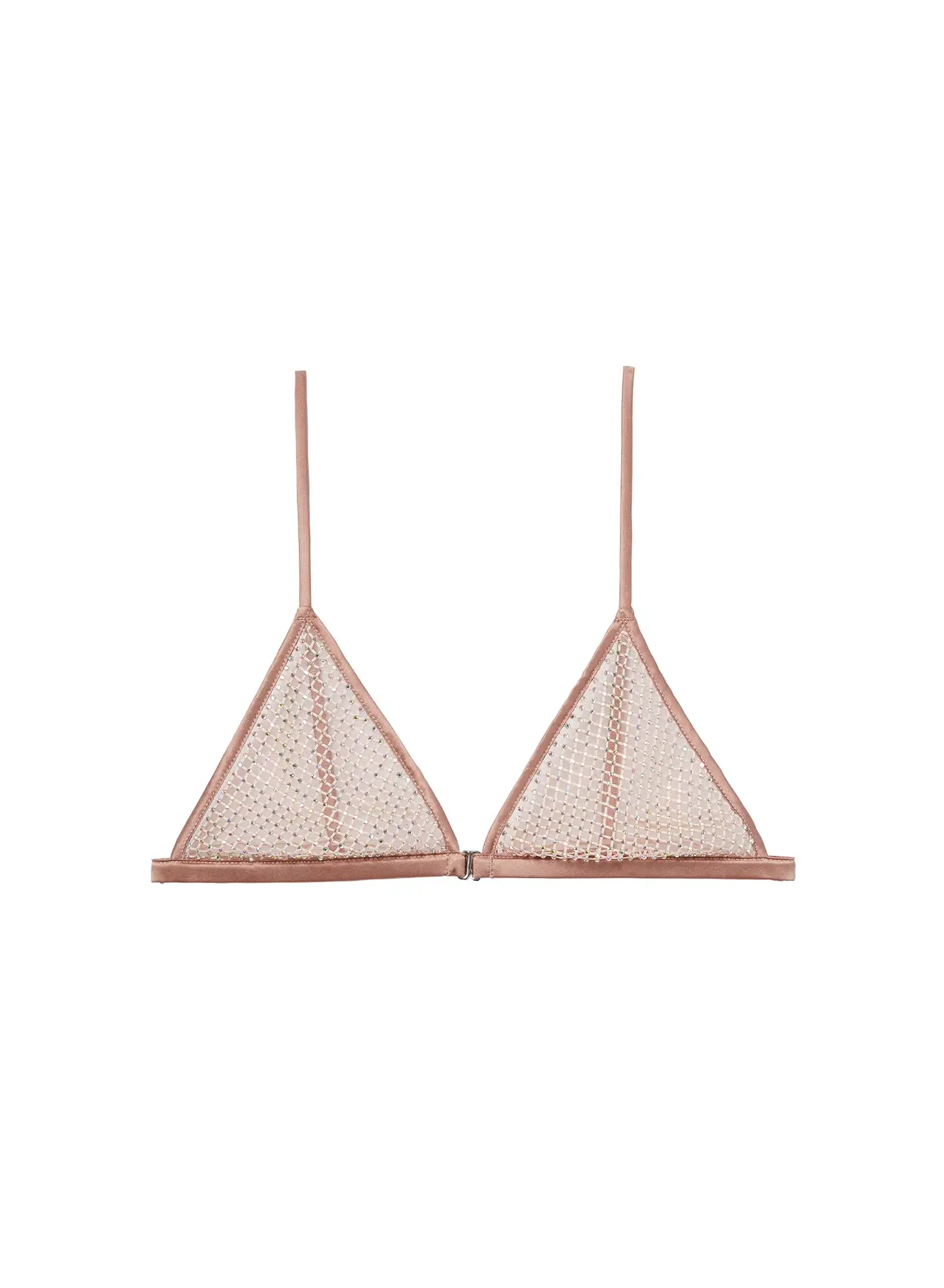 Jaw dropper. Our Rhinestone Fishnet Triangle Bra, cut from sexy sheer mesh with allover crystal rhinestone detailing. Features smooth band and adjustable silk covered straps. Take it out under a blazer, or pair with the Feather Embellished Angel Sleeve Robe and matching Rhinestone Fishnet V String for an intoxicating, after-dark look.