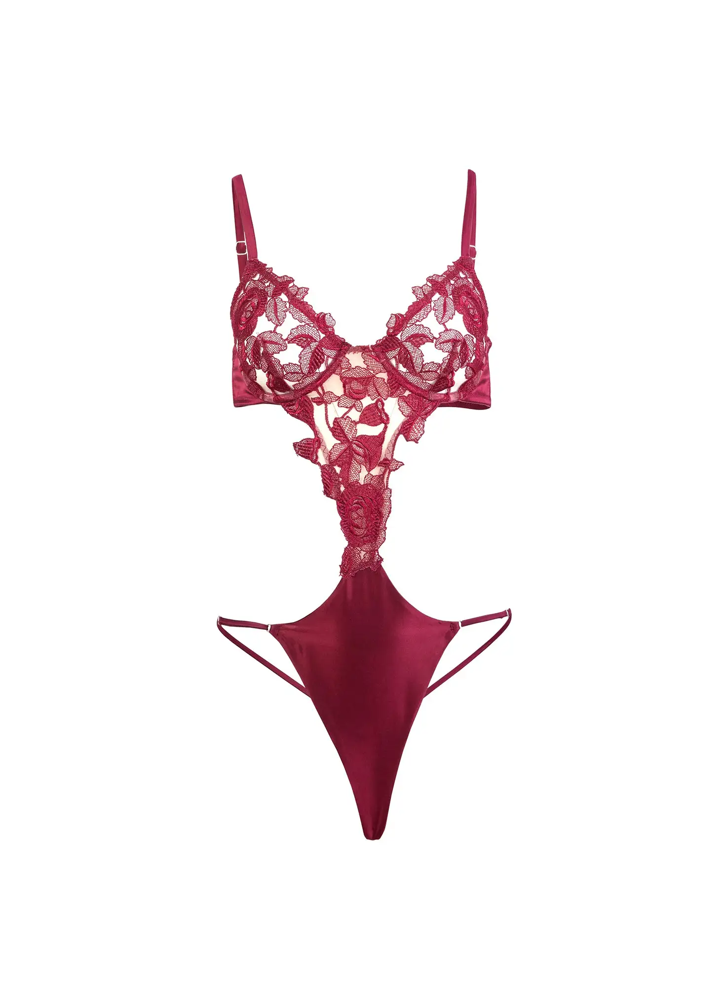 La vie en rose. Our Rose Embroidery Bodysuit, with stunning custom Swiss rose embroidery. This ultra sexy bodysuit features cutout sides that give way to a silk v-string shape with back rose appliqué detail. Flirty scalloped underwire cups and adjustable straps. Flaunt all on its own for an unforgettable after dark look.