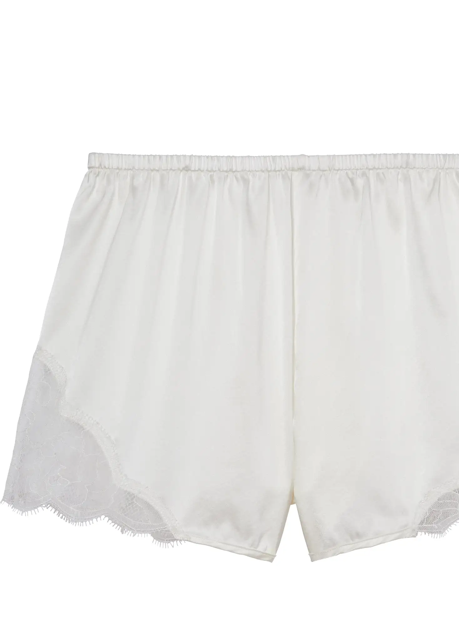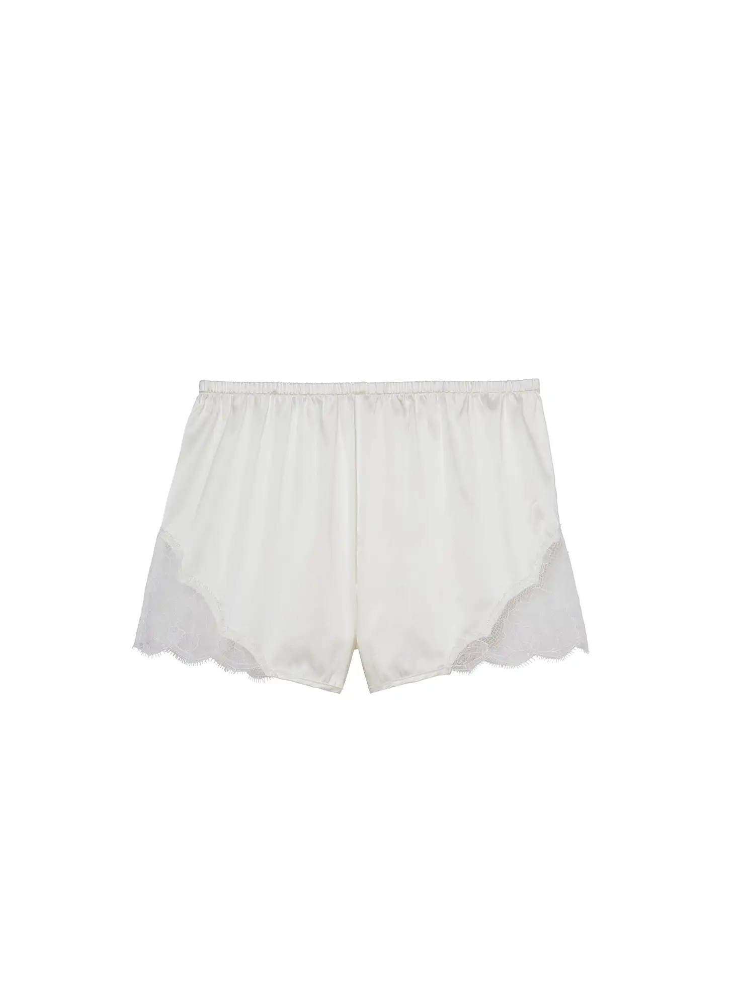Short and sweet. Our Rose Lace Short is cut from ultra luxe silk charmeuse and adorned with a delicate French Leavers lace appliqué. Elasticized waist, cut to be cheeky. Pair this beautiful after-dark piece with the matching Rose Lace Cami.