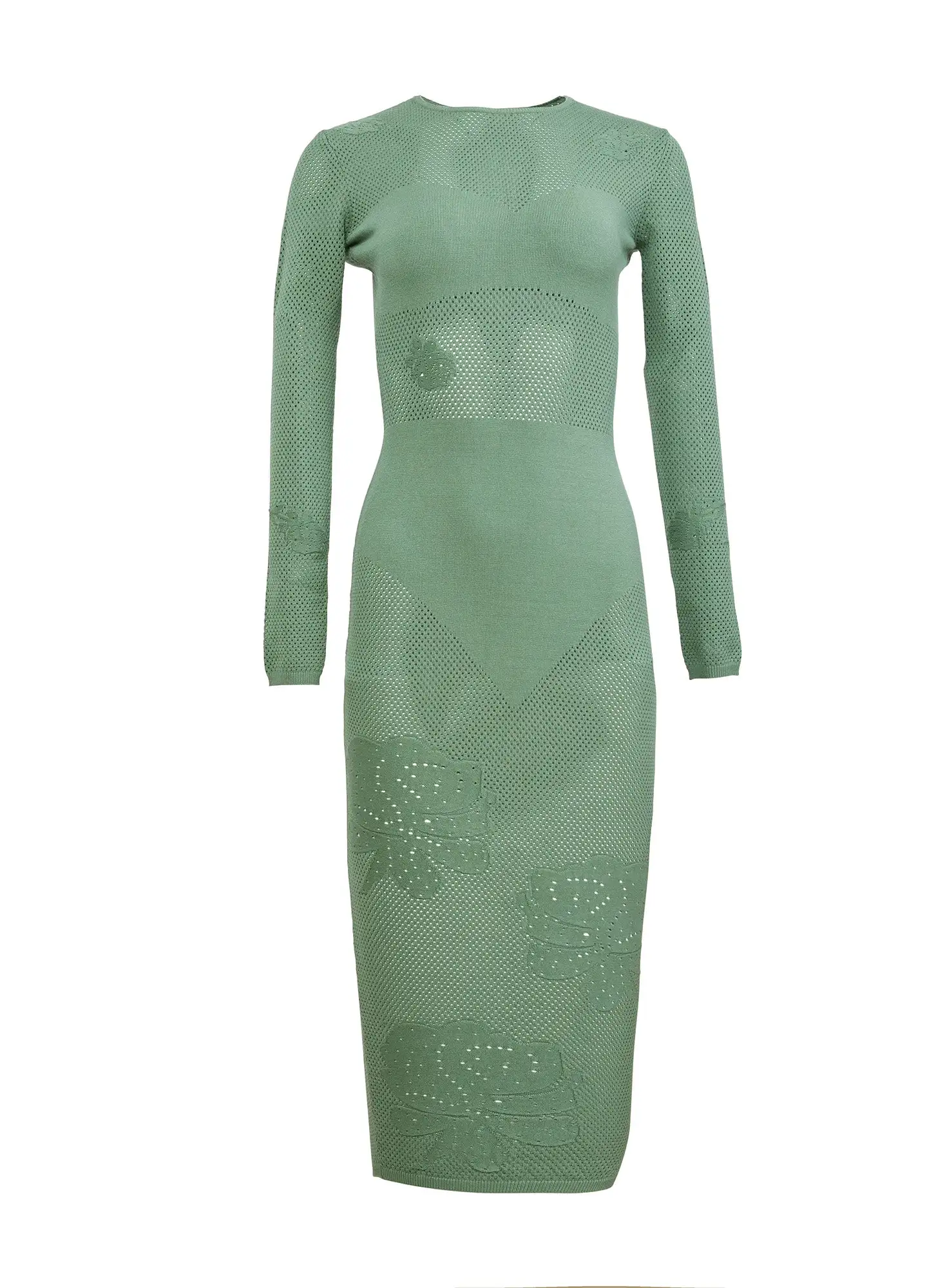 Our Rose Pointelle Knit Dress, cut from soft stretch knit that hugs your body in all the right places. Features perforated pointelle with intarsia roses and long sleeves. Solid top and bottom panels for added coverage. Midi length. Layer over your favorite Essentiels panty for a chic look that will take you from happy hour to after hours.